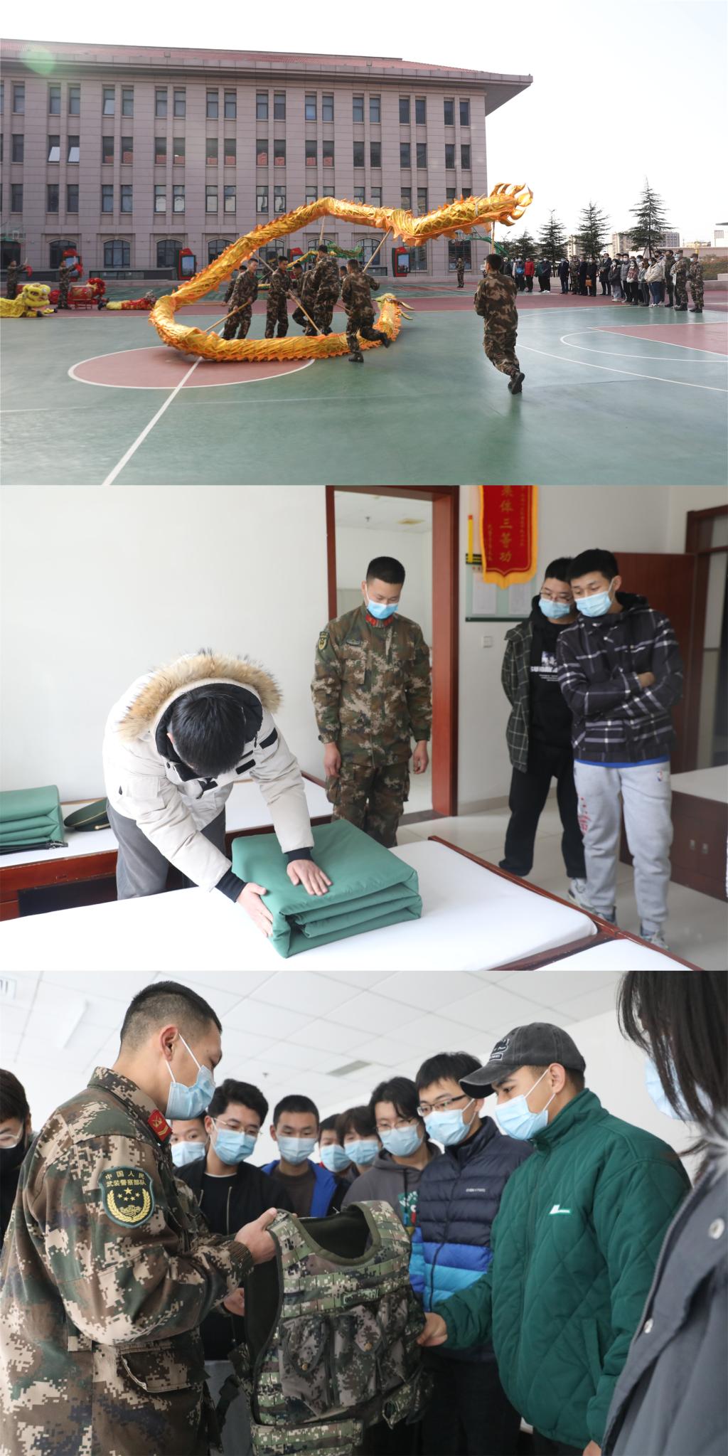 随后,某中队战士们的舞龙舞狮表演以新颖的编排、灵活的动作、默契的配合,充分展现了团队合作精神和活力军营文化,让师生感受了部队文化育人、文化建队氛围。中队指导员带领师生们参观了荣誉室、党员之家、官兵营房,介绍了部队政治思想、党建工作的开展情况,展示官兵们作战装备、内务设置及日常生活,生动讲述军人生活中的趣事。同学们在支队官兵的手把手教授下,纷纷动手体验叠军被、整理内务,深入体会整齐划一、严格有序的军人作风。