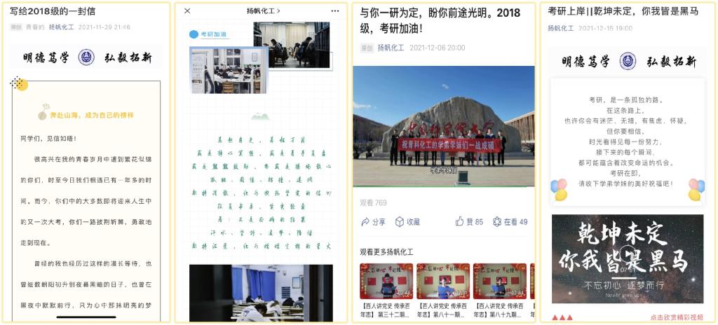 一“研”为定,温情护航。考研进入冲刺期后,化工学院团委多措并举开展“情暖考研人”系列活动。扬帆化工公众号发布近10篇考研倒计时系列推文,毕业生辅导员为考研学子写下一封鼓励信,优秀毕业生、在校生及辅导员老师分别录制3期考研加油视频,用心守护学生成长,用爱助力梦想起航。