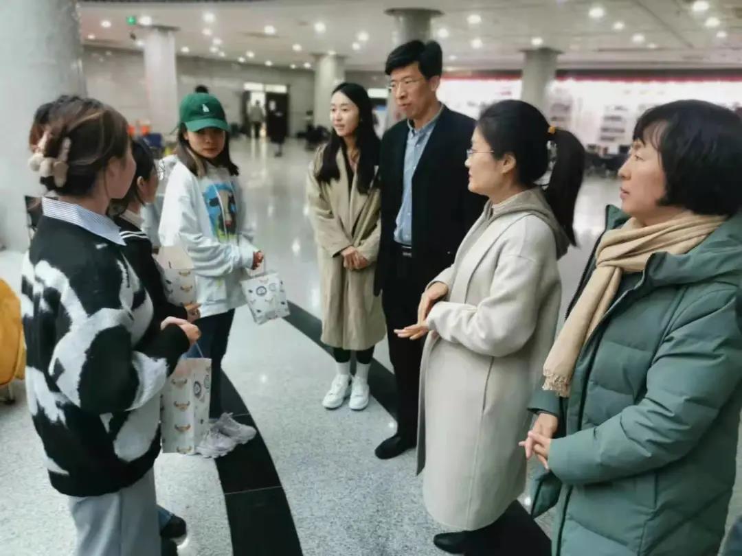 随后,老师们来到图书馆和宿舍楼,为考研学子送上祝福。他们关切地询问了同学们的复习成果,并嘱咐学生天冷要加衣。谆谆话语中,展现了老师们对考研学生的关爱。