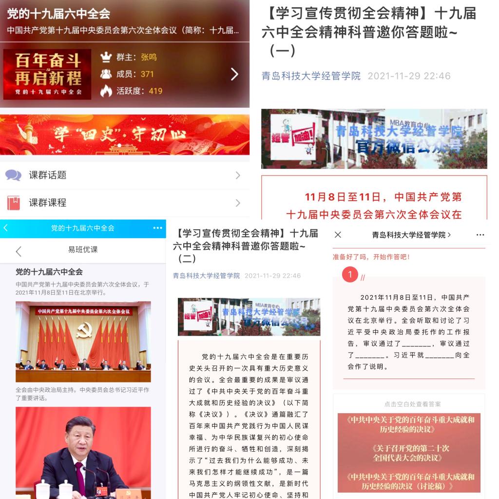 经管学院依托学习强国、学院官网、微信公众号、易班等途径,构建网络化育人平台,打造网格化协同育人体系。利用易班优课推送十九届六中全会精神学习课程,引导学生关注全会重点热点,深刻把握精神实质。通过学院公众号平台推送十九届六中全会热点要闻等系列主题教育以及十九届六中全会精神科普问答,引导学生聚焦全会细节,通过问答帮助学生做到自学自检,确保学生原原本本学、融会贯通学。学院还通过建立学习强国班级群,充分利用强国教育资源,引导学生深入交流研讨,在交流中加深对十九届六中全会精神的理解。