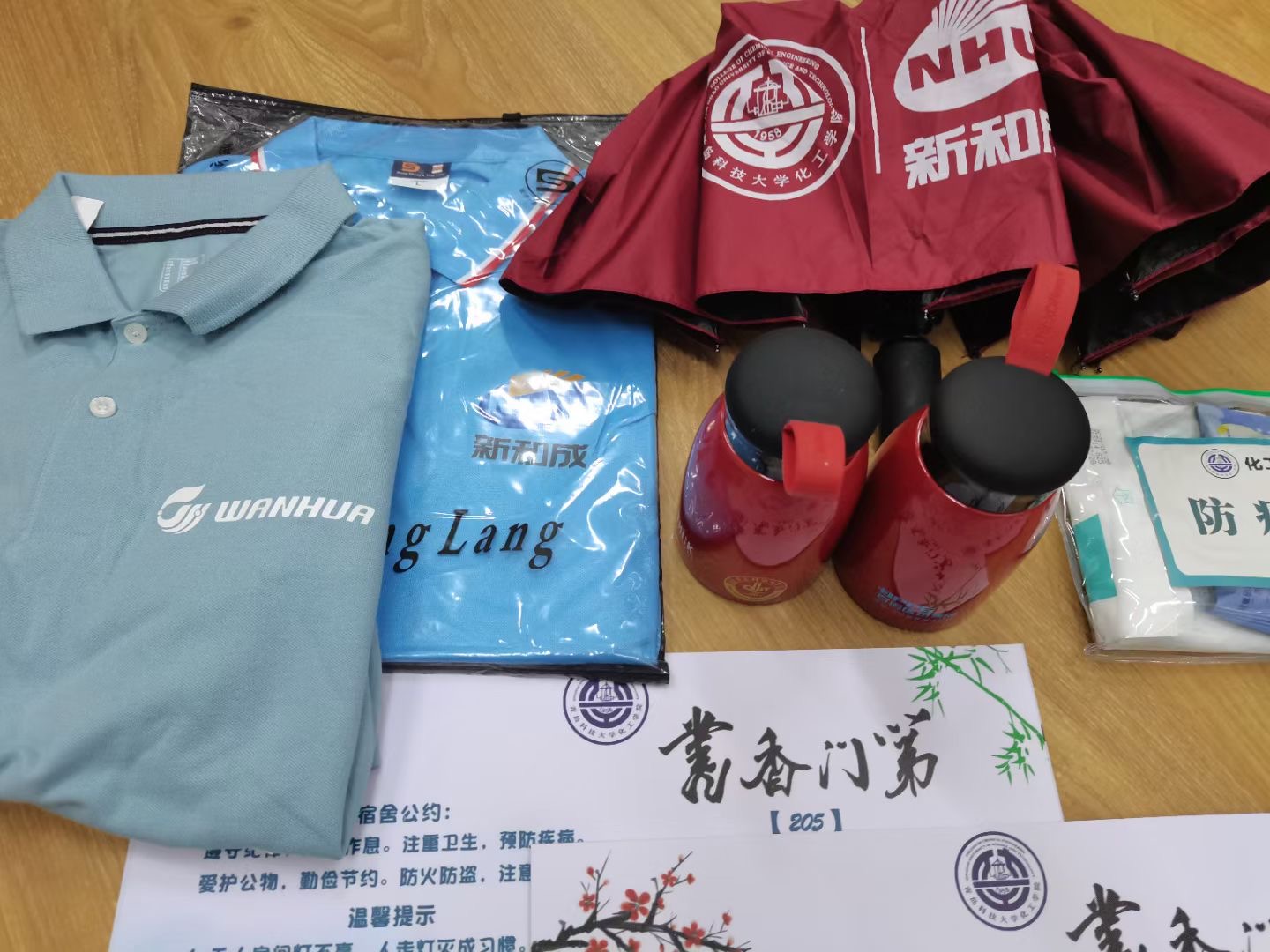 学院联系万华化学、百诺医药、新和成、豪迈集团等知名化工制药类企业,为学生定制“新生大礼包”,发放保温杯、文化衫、手提袋、防疫包等新生生活用品。对新生宿舍进行精心布置与整理,制作了精美的门贴、床贴,着力营造温馨的宿舍环境,提供暖心服务与物资保障,激励学生成长成才。
