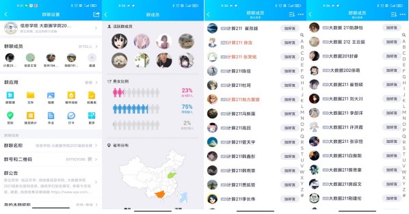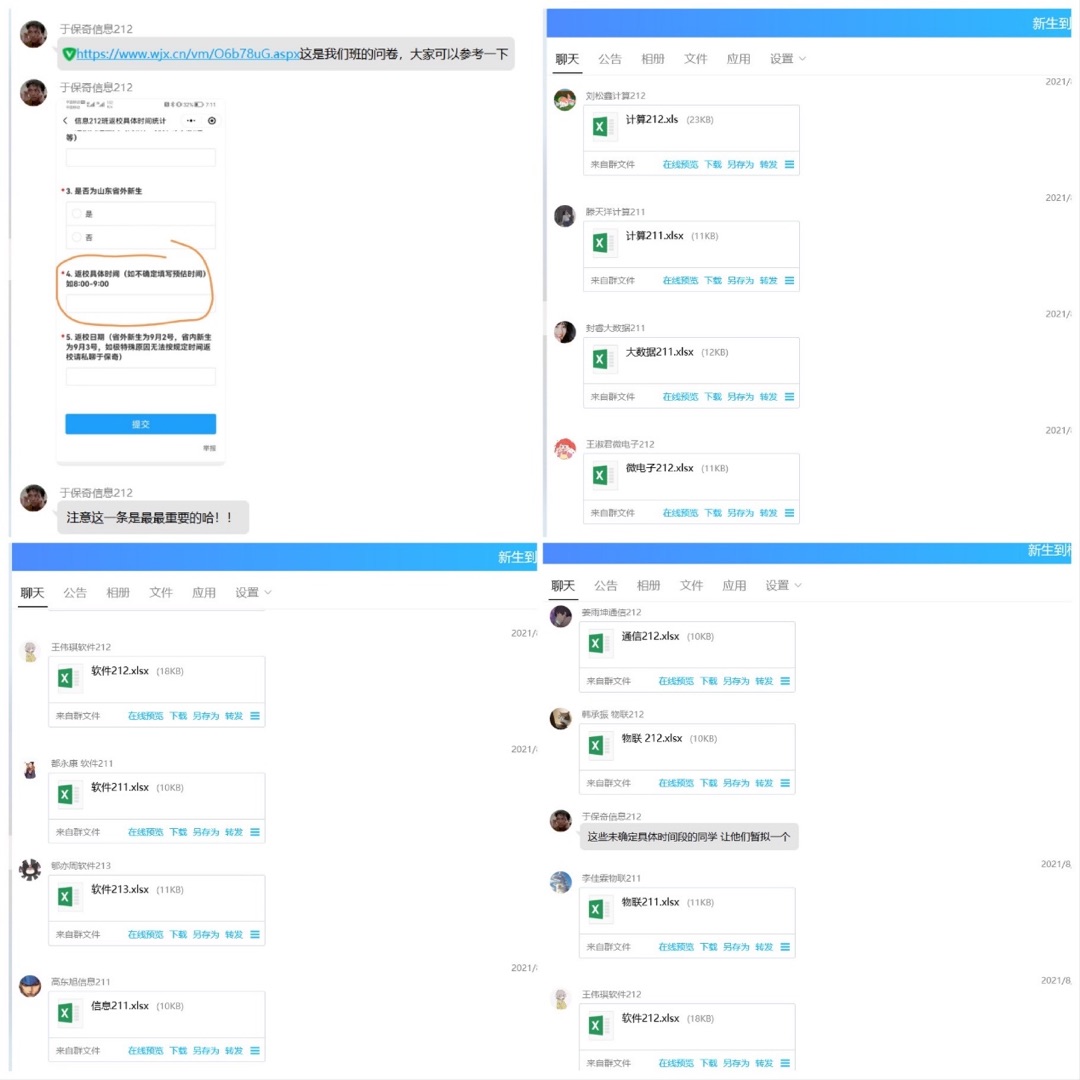 为能及时向2021级新生传达学校学院通知,帮助新生答疑解惑,便于日后更好地适应大学生活、尽快适应新环境,信息学院、大数据学院建立官方2021级新生群、班级群。与此同时,为确认每位新生的入群情况以及个人信息的完备情况,学院依托学生会、领航学长积极主动地与新生取得联系并确认信息。成员之间分工合作、团结一致,99.55%新生已入群,为后期各项工作的开展提供保障。