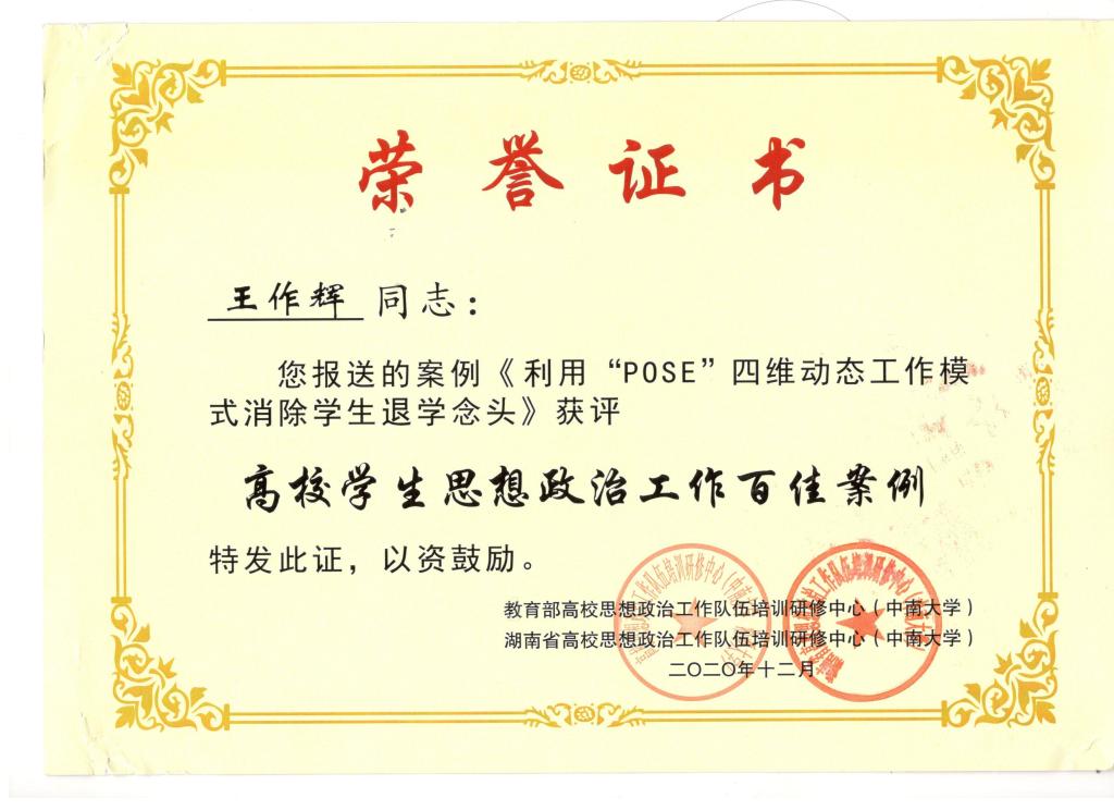 近日,教育部高校思想政治工作队伍培训研修中心(中南大学)公布了2020年高校学生思想政治工作百佳案例的遴选结果。由机电学院学工办主任兼团委书记王作辉申报的《利用“POSE”四维动态工作模式消除学生退学念头》成功入选《高校学生思想政治工作百佳案例》。