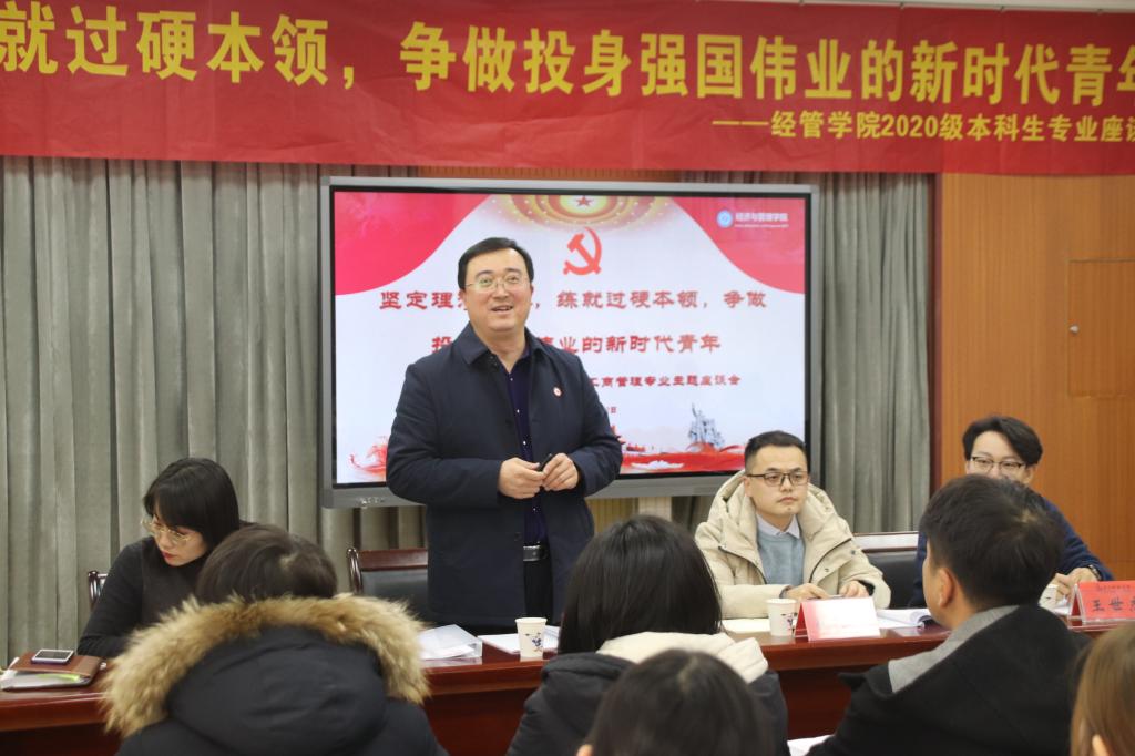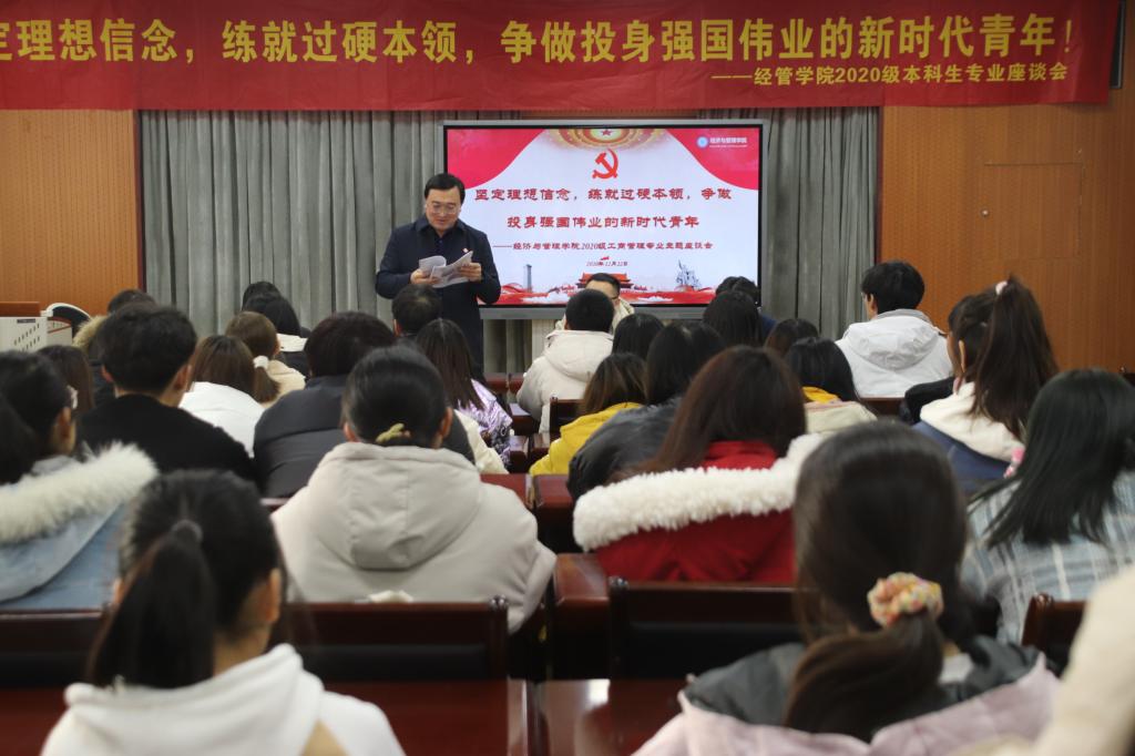 为积极响应学校机关处级干部联系学生班级通知精神,落实立德树人根本任务,进一步提升日常学生管理水平,服务学生成长成才,12月22日下午,经管学院2020级工商管理专业“坚定理想信念,练就过硬本领,争做投身强国伟业的新时代青年”主题座谈会于学院504会议室举行,党委(校长)办公室副主任匡荣富出席此次座谈会,与同学们亲切交流,从职业生涯规划出发畅谈使命担当。2020级工商管理专业班主任代同亮、新生辅导员及领跑学长共同参加,座谈会由20级辅导员付凯主持。