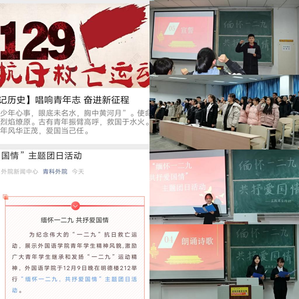 讲好爱国故事,凝聚奋进力量  充分利用QQ空间、微信公众号、网站等媒体平台回顾“一二·九”运动,聚焦爱国主义教育,积极运用互联网思维和新媒体语言讲好爱国故事,使爱国主义充盈网络空间。外国语学院组织青年团员代表积极了解“一二·九”运动,讲述并分享“一二·九”运动中的英雄事迹。青年团员代表结合自身实际,结合新时代的先进典型与榜样模范,号召广大青年学生弘扬伟大精神、激发昂扬斗志。
