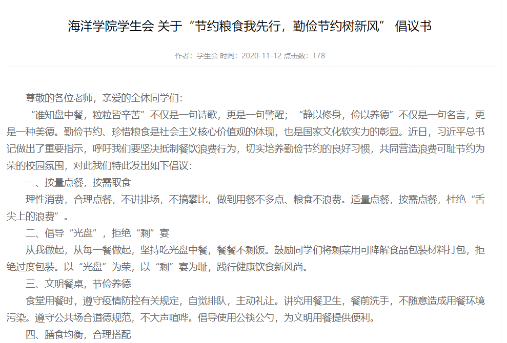 为了将勤俭节约的思想理念深入学生心中,海洋学院学生会向全院师生发起关于“节约粮食我先行,勤俭节约树新风”的倡议书,呼吁广大师生在生活和学习的各个环节主动做到节约用水、用电、用纸,倡导低碳出行、绿色生活新风尚,让节约之风吹进科大校园。