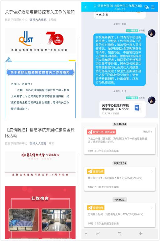 学院积极利用网络新媒体等平台,坚持学生工作不间断,思想教育不断线,做好学生日常管理,强化学生思想引领,全力维护学校的安全稳定。辅导员们依托微信、QQ等线上平台,全面、及时地向全体学生传达学校的各项规定和要求,做到信息传递地上通下达,做好校情传达工作。学院通过“微科大大信息”公众号、学院官网等线上平台推送疫情防控相关内容,各年级辅导员通过年级群等网路平台积极向学生宣传和普及防控知识,传达新的防控要点,督促学生加强个人防护,避免病毒感染。学院依托“今日校园”app平台,积极开展学生健康信息报送制度,形成了学院-学办-辅导员-班级-个人五级防控联络机制,每天对学生健康信息进行汇总收集,确保防控信息及时全面准确。