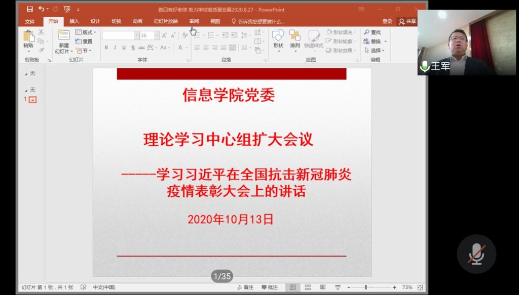10月13日下午,信息学院党委理论中心组(扩大)会议通过线上腾讯会议的方式组织召开,党委书记刘庆带领学院全体师生党员认真学习了习近平总书记在全国抗击新冠肺炎疫情表彰大会上的重要讲话。院长刘国柱对近期学校疫情防控工作提出要求,传达学习了学校疫情防控工作领导小组办公室下发的“关于做好近期疫情防控有关工作的通知”。学院学工办主任、团委书记曲智强以巡察整改中的问题为导向,在主题党日活动、“三会一课”、党费收缴等党建工作提出要求。