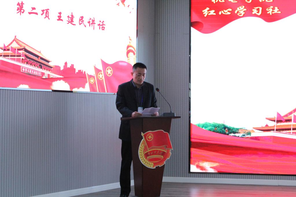 王建民代表校党委宣传部向机电学院“青年讲师团”的成立表示诚挚的祝福,并提了三点希望:第一,要尊重青年的主体地位,注重围绕青年思想认知规律,探索更加有效的宣讲方式和载体;第二,要注重讲师队伍质量,又要重视宣讲活动效果,真正做到对青年群体广泛覆盖、取得实效;第三,要紧密结合“不忘初心、牢记使命”主题教育,制度化开展理论宣讲,示范带动全校各级团组织实施“青年讲师团”计划。