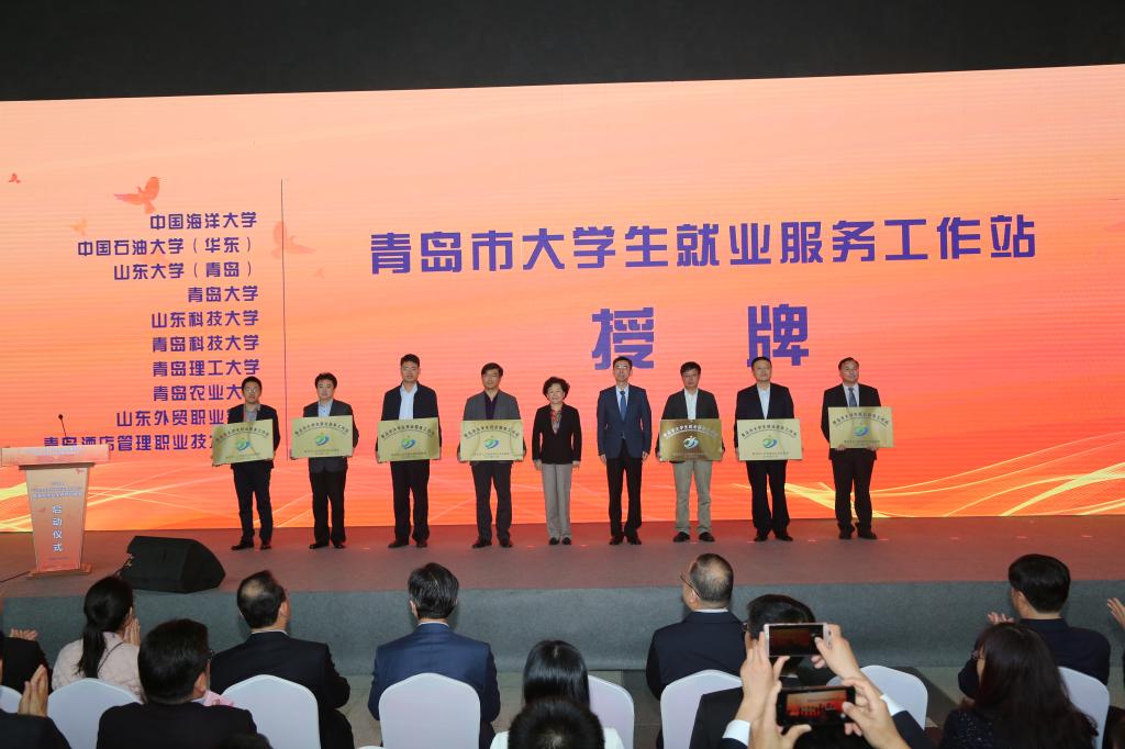 仪式上,边祥慧、金鲁峰、胡义瑛等领导为青岛市大学生就业服务工作站授牌,并为在青高校人社服务专员颁发聘书。学校学生处处长陈刚代表学校接受工作站授牌。
