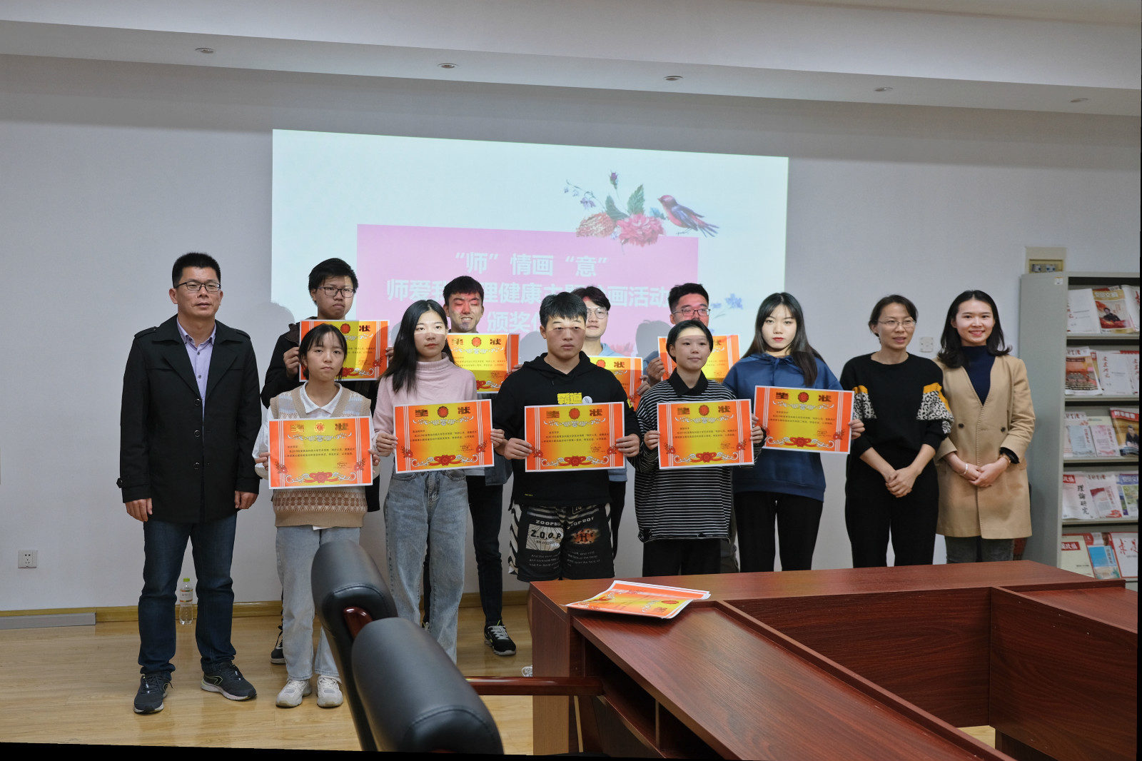 10月24日下午,艺术学院在213会议室召开“师”情画“意”之“师爱我”心理漫画征集大赛颁奖仪式,对学院前期开展的“呵护心灵、健康成长”心理健康主题绘画活动进行奖励表彰,学院党总支副书记兼副院长刘名森、分团委辅导员及参赛者参加颁奖仪式。仪式共为22名获奖者颁发荣誉证书。刘名森对获奖者表示祝贺,并鼓励其在今后的学习生活中积极向上、阳光奋进。