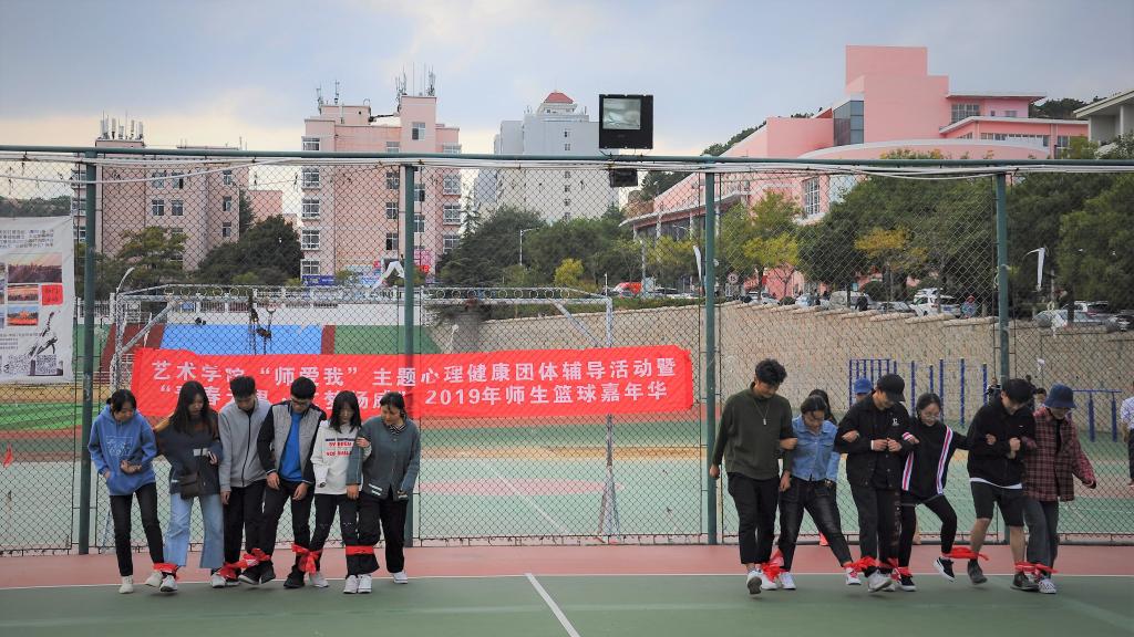 10月25日下午,艺术学院在崂山校区南苑操场举行“师爱我”主题心理健康团体辅导活动暨“青春无畏、艺梦扬威”师生篮球嘉年华,学院副院长曲国先、党总支副书记兼副院长刘名森及分团委辅导员、学生40余人参加。“喊数抱团”、“十人九足”、“爱的团团转”传来阵阵欢笑,暖意球场。篮球场声声呐喊,师生角逐,热情高涨。