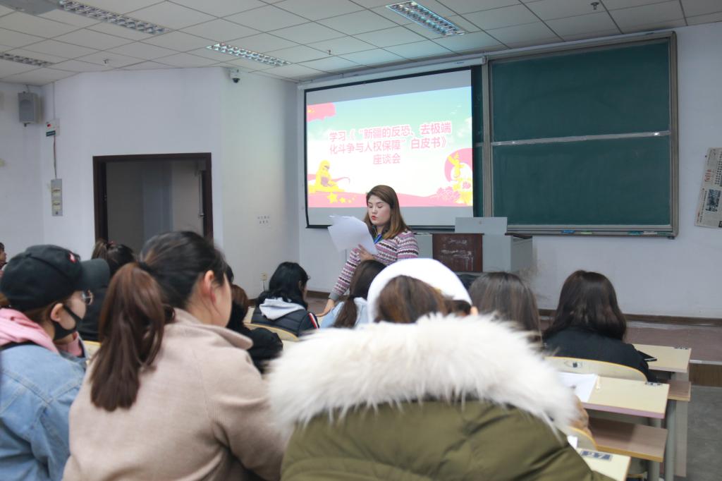 会上,两位老师带领大家一起观看了2019年两会相关视频学习《政府工作报告》和《新疆的反恐、去极端化斗争与人权保障》白皮书的主要内容。在心得交流环节,同学们踊跃发言,纷纷表示,作为新时代的大学生,要积极亮剑表明立场,团结在以习近平同志为核心的党中央周围,发挥自身作用,坚决维护民族团结,坚决同“三股势力”作斗争,要像石榴籽一样与各族群众紧紧抱在一起!