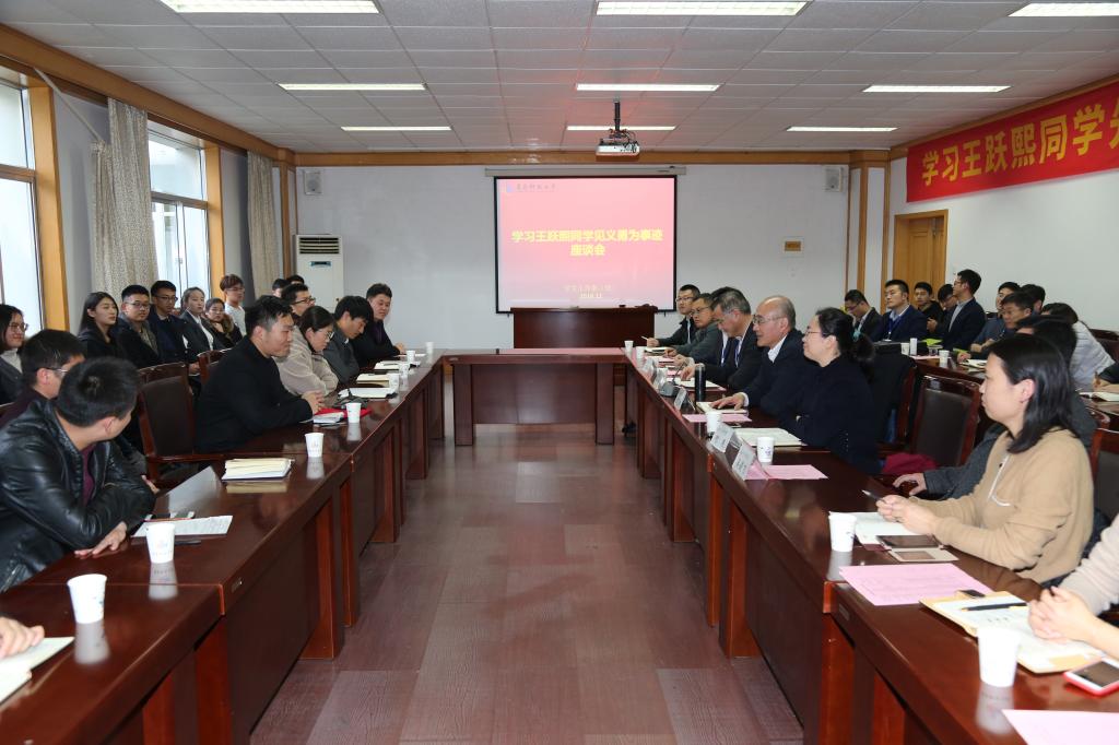 12月4日,学习王跃熙同学先进事迹座谈会在崂山校区南区2号楼313会议室召开。党委常委、副校长陈克正出席座谈会并讲话。机电学院院长何燕,研究生院院长吴俊飞,校团委书记王锋业参加了座谈会。座谈会由学生处处长陈刚主持。