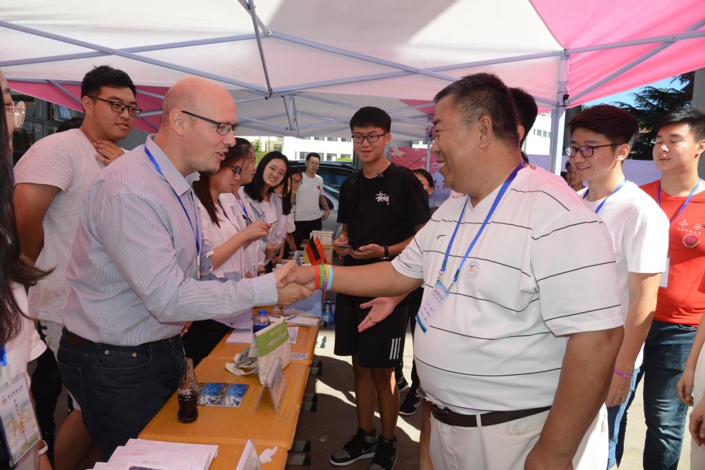 中德科技学院邀请了外籍教师参与迎新,迎新现场赠送学生胸牌和“飞往德国的机票”,教育引导新生亮明中德身份,励志留学德国深造。