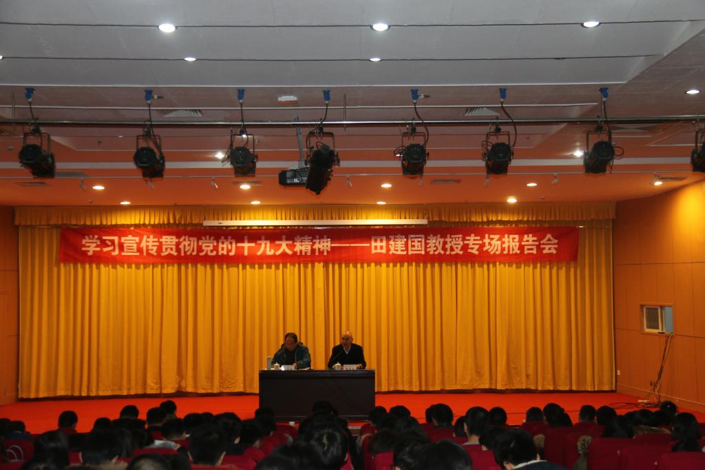 田建国在给全体政工干部作了题为“学习贯彻党的十九大精神 落实立德树人根本任务”的报告,他首先强调了“学懂、弄通、落实”十九大内容和精神的重要性,然后从充分认识党的十九大召开的重大意义、准确把握十九大报告的主要内容和认真学习贯彻大会精神等方面宣讲了党的十九大精神。他特别指出,习近平总书记在十九大报告中要求把教育摆在优先发展的战略地位,实施创新发展战略,推进“双一流”建设,加强人才培养。他还从认识立德树人的教育背景;把握立德树人的理想核心,树立坚定的理想信念;坚持立德树人的教育取向,培养学生正确的世界观、人生观、价值观等几个方面剖析了高校思想政治教育面临的挑战和落实立德树人的根本任务。报告既有对习近平总书记重要讲话精神的深刻解读,也有田建国教授自己多年来对高校思想政治工作的体会理解。