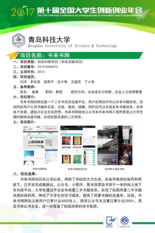 本届年会共收到全国各高校推荐项目1066项,经过学校推荐、地方教育主管部门审核复选、教育部专家终审等环节,共有236所高校的403个成果入选。其中,学术论文166篇、创新创业展示项目188项、创业推介项目49项,代表了全国各高校最新的创新创业教育成果。伟德官网推荐的“书来书网”项目(编号:201410426072)最终成功入选年会的创业推介项目,这也是继第八届“大创”年会后伟德官网国创项目第二次入选。此项目是由经管学院教师姜真指导,刘洋(机电学院)、李宗英(机电学院)、梁贵平(机电学院)、沈夕惟(传播学院)、王超范(经管学院)、丁小亮(法学院)等学生共同参与研究和实践,已于2015年顺利通过结题验收。