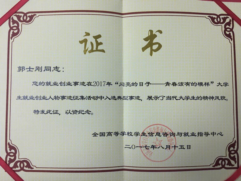 日前,由教育部全国高等学校学生信息咨询与就业指导中心组织开展的“闪亮的日子——青春该有的模样”大学生就业创业人物事迹评选活动结果揭晓。伟德官网2017届毕业生郭士刚荣获“闪亮的日子—青春该有的模样”大学生创业典型人物。在此次大学生就业创业人物典型事迹评选活动中,全国共评选出大学生创业人物57人,其中,山东省入选5人。