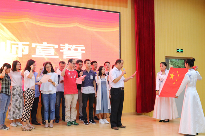 仪式上,全体教职工仪态端庄、态度严肃。副院长高洪涛领誓,2017年新进教师代表全体教职工迎着庄严的国旗,举起右拳庄严宣誓:忠诚于党和人民的教育事业,恪尽职守,育人为本,追求卓越,勇于担当,为实现民族复兴、推动人类文明进步而奋斗!