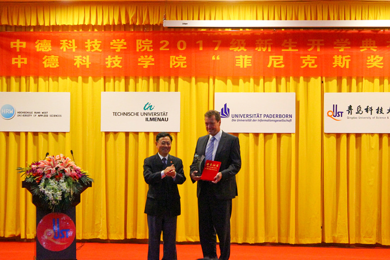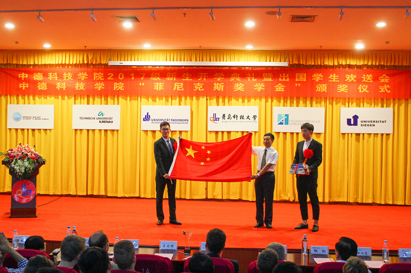 9月11日下午,中德科技学院2017级新生开学典礼暨出国学生欢送会在崂山校区第三报告厅举行。校党委副书记李庆领,德国帕德博恩大学、科布伦兹应用科技大学、菲尼克斯(中国)投资有限公司及学校相关部门负责人、师生代表参加了活动。
