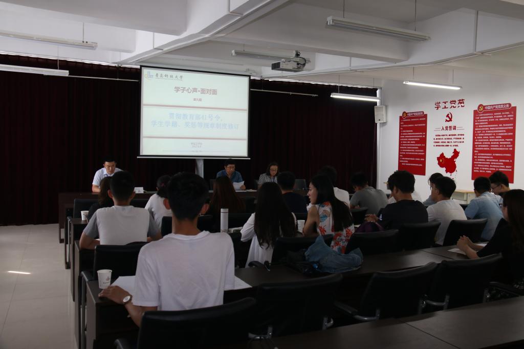 6月9日,学校第九期“学子心声”活动之“贯彻教育部41号令,学生学籍、奖惩等规章制度修订”学生干部座谈会在崂山校区心理咨询中心举行。学生处处长陈刚、教务处副处长尚猛及学生处、教务处相关各科室负责人、学校部分学院学生代表20余人参加了座谈会。