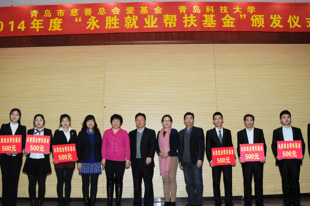 16日下午,学校在崂山校区第一报告厅举行2014年度“永胜就业帮扶基金”发放仪式。青岛市慈善总会爱基金名誉会长、基金捐资人李聪解,青岛市慈善总会爱基金常委、救助部部长林迎春,学生处处长郑德前,学生处副处长肖强及全校100名受助应届毕业生参加了此次仪式,仪式由学生处副处长秦姣主持。