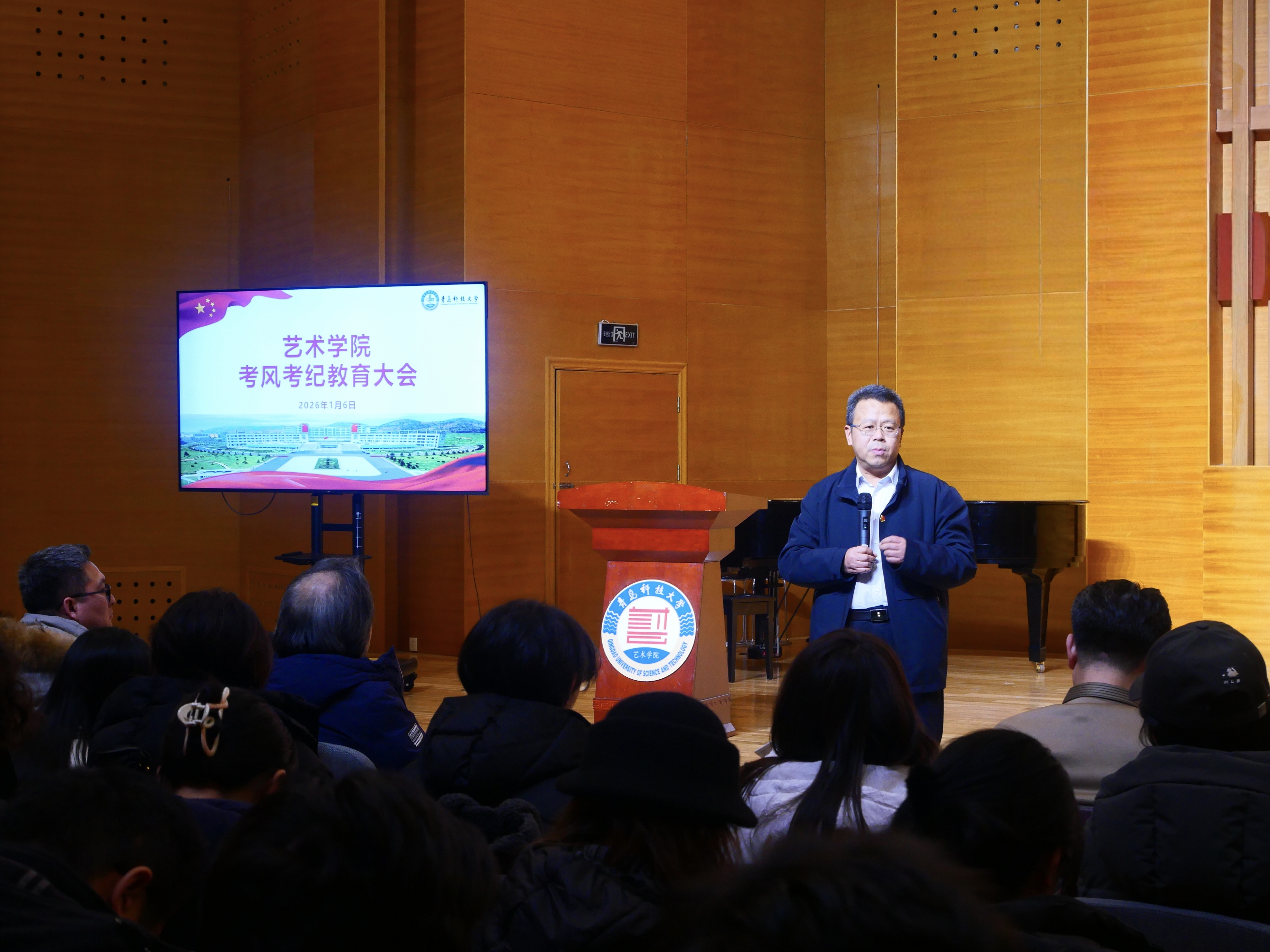为进一步强化学生考风考纪意识,营造公平公正、诚信应考的良好氛围,近日,艺术学院在音乐厅召开考风考纪教育大会。会议由党委书记刘庆主持,学院领导班子、全体学生党员及各班班委参加了会议。