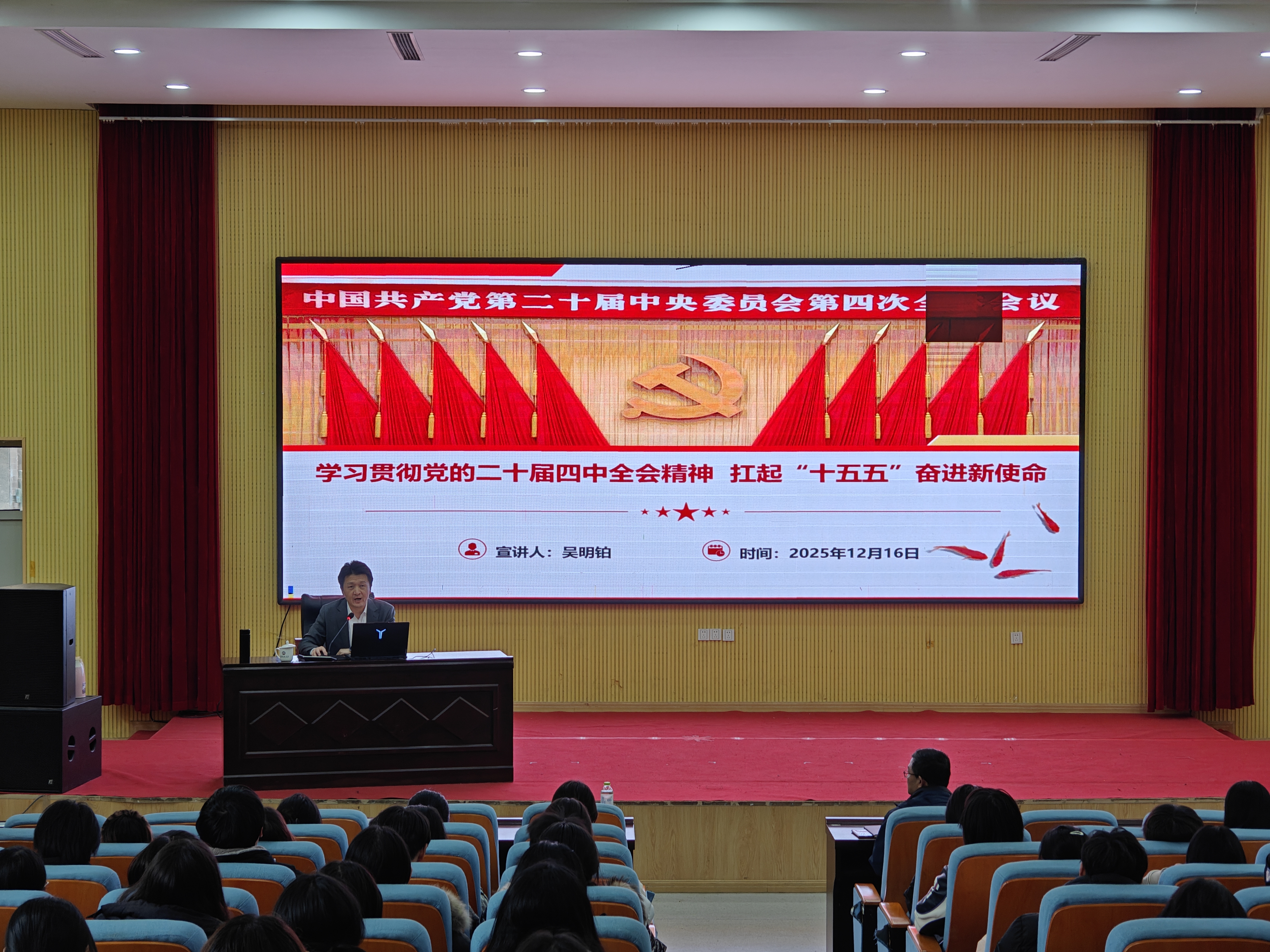 吴明铂以《学习贯彻党的二十届四中全会精神,扛起“十五五”奋进新使命》为主题,通过生动的案例、翔实的数据系统回顾了“十四五”时期我国经济社会发展取得的历史性成就,并对党的二十届四中全会的重要意义、《中共中央关于制定国民经济和社会发展第十五个五年规划的建议》擘画的未来五年发展蓝图、目标、原则与具体部署进行了详细的讲授。结合学校“十四五”发展成就及“十五五”规划,吴明铂重点总结了学校在学科建设、人才培养、科技创新等领域实现的突破性进展,详细介绍了学校“十五五”擘画的“1个总体规划+9个专项规划+2个特色规划+N个学院、部门、校区规划”的未来规划蓝图。他勉励学生要把握发展机遇,充分发挥生物、化学等基础学科的支撑与交叉融合优势,积极融入学校整体发展战略,培育创新发展新动能,在服务国家战略和学校发展中展现新担当、实现新作为。