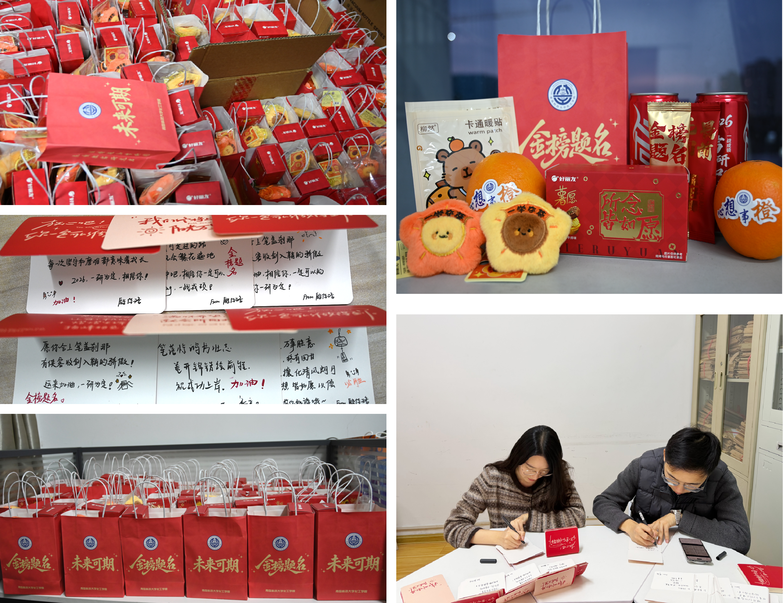 老师们为2026届考研学子专属定制了“考研暖心礼包”,每一份都寄托着学院的美好期望与细致关怀:辅导员老师手写祝福卡、印刻姓名的定制可乐、寓意“心想事成”的新鲜橙子、“一举夺魁”毛绒挂饰、实用的卡通暖贴、印刻祝福语的能量零食包与棒棒糖,让这份礼包既具实用价值,又成为备考冲刺的“精神能量包”。