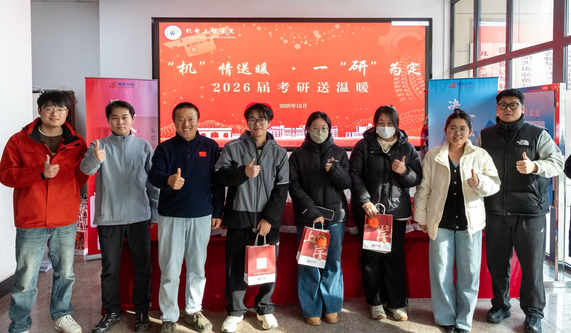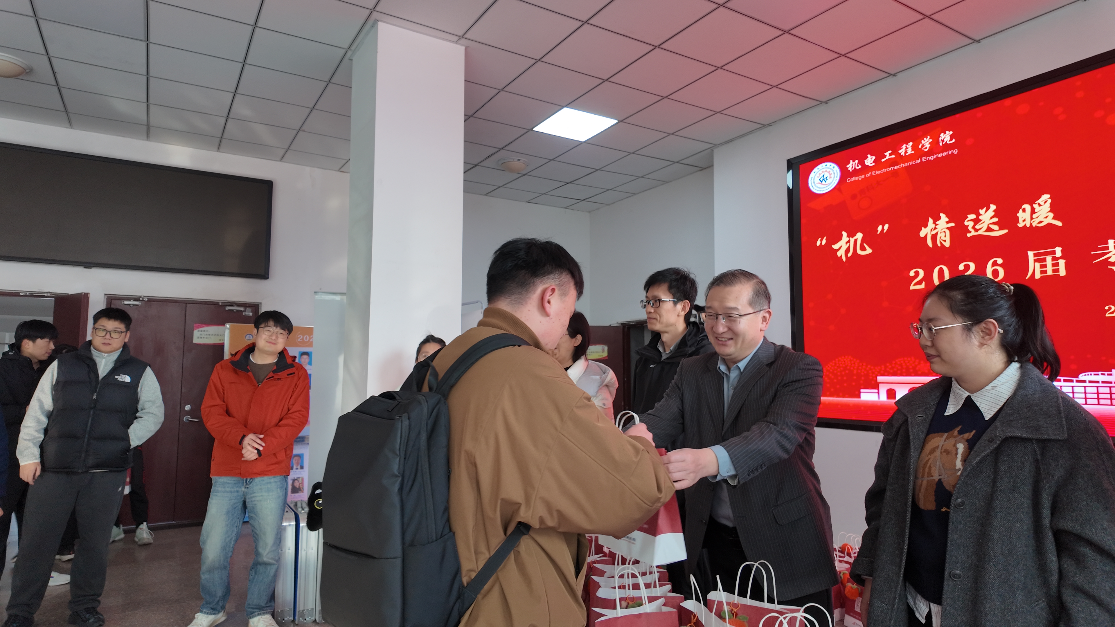12月12日,机电工程学院在机电楼大厅、530会议室举行“‘机’情送暖、一‘研’为定”2026届考研送温暖活动。学院领导班子和全体辅导员参加活动,为奋战在考研冲刺一线的学子送去暖心关怀与坚定支持。