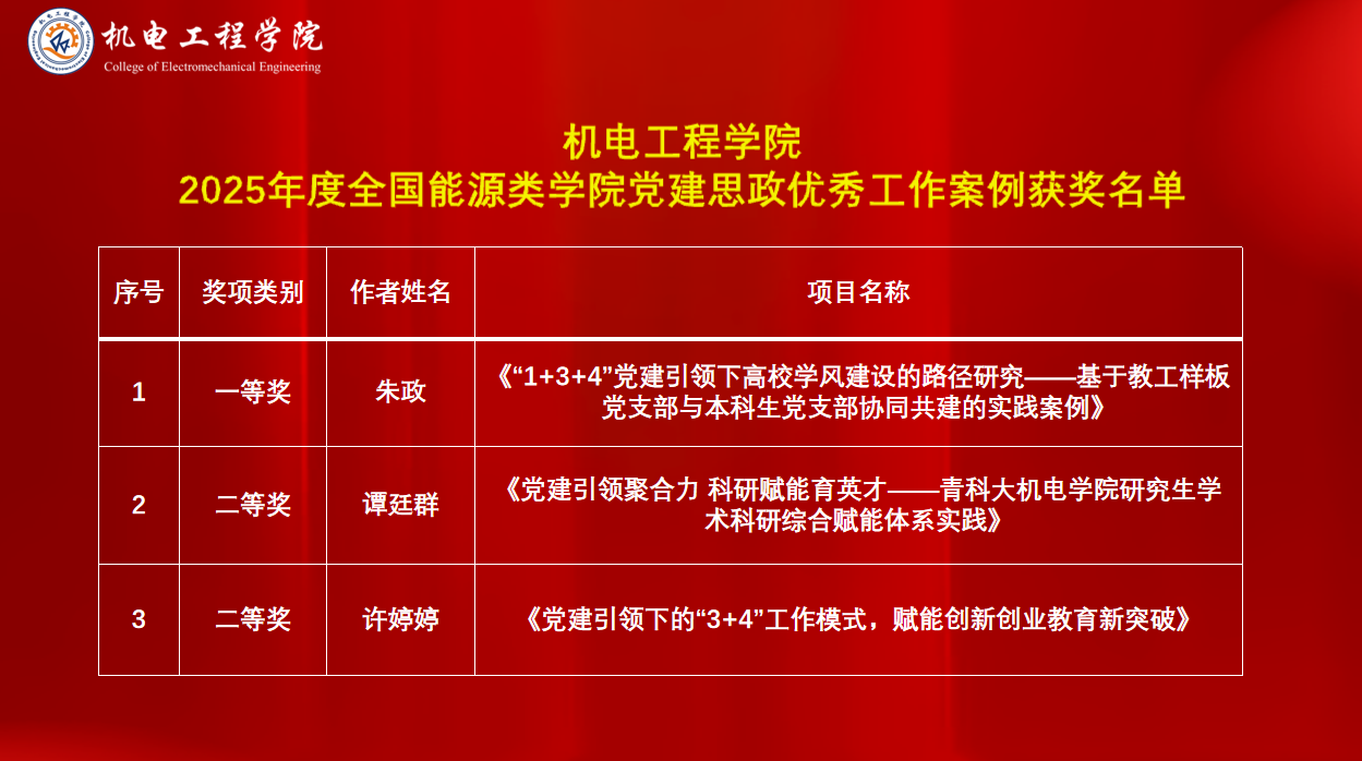 近日,全国能源类学院党建思政工作组织委员会公布了2025年度全国能源类学院党建思政优秀工作案例获奖名单,机电工程学院共获奖3项。其中,朱政申报的《“1+3+4”党建引领下高校学风建设的路径研究——基于教工样板党支部与本科生党支部协同共建的实践案例》荣获一等奖,谭廷群申报的《党建引领聚合力、科研赋能育英才——青科大机电学院研究生学术科研综合赋能体系实践》和许婷婷申报的《党建引领下的“3+4”工作模式,赋能创新创业教育新突破》荣获二等奖。