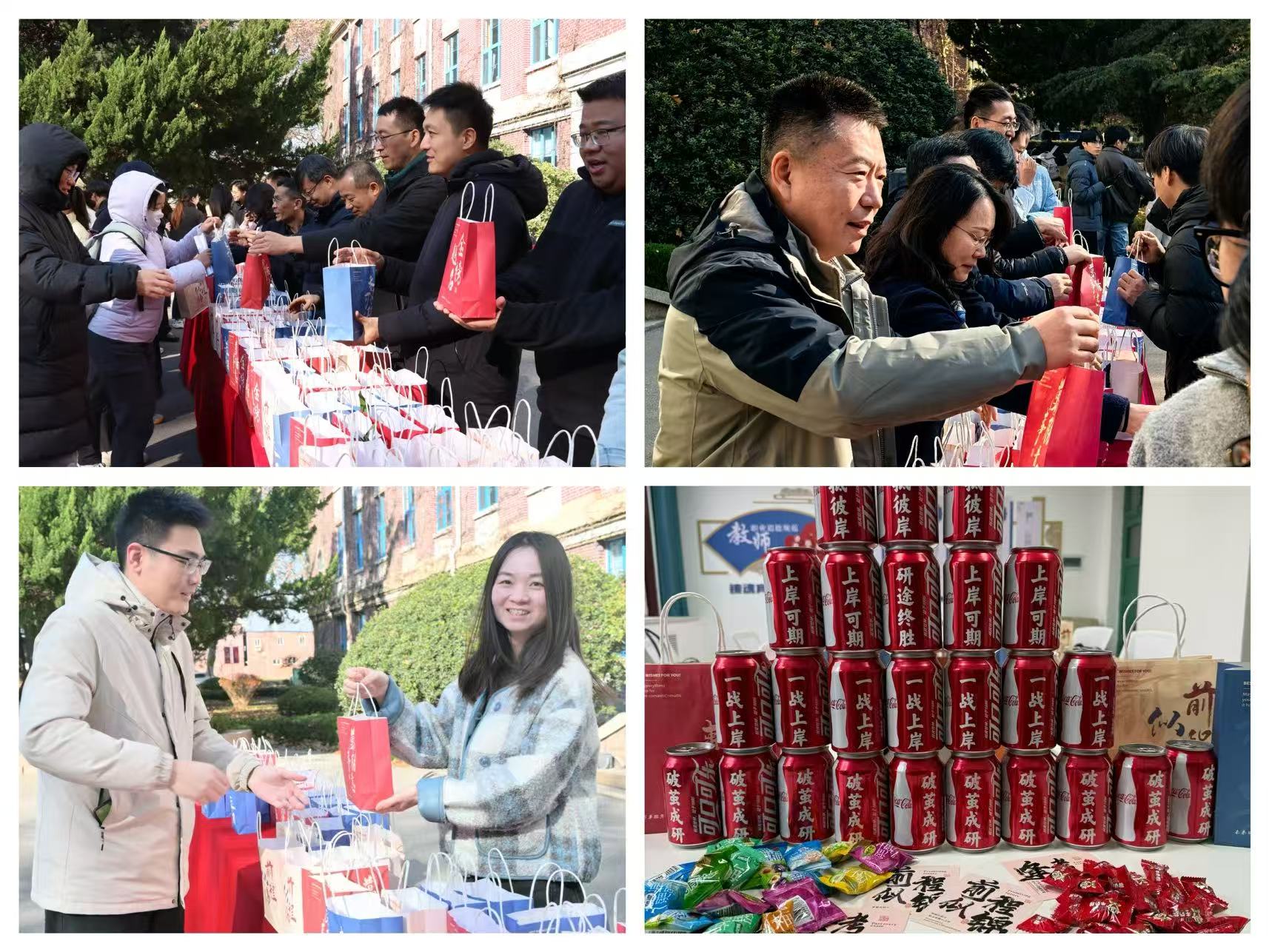化学院在第一行政楼前设立“考研能量补给站”,为全体考研学子发放“考研加油大礼包”。“考研橙”、定制可乐、暖身贴以及助力书签承载着化学院师生的期愿,寄托着化学院对考研学子们的亲切关怀和祝福。