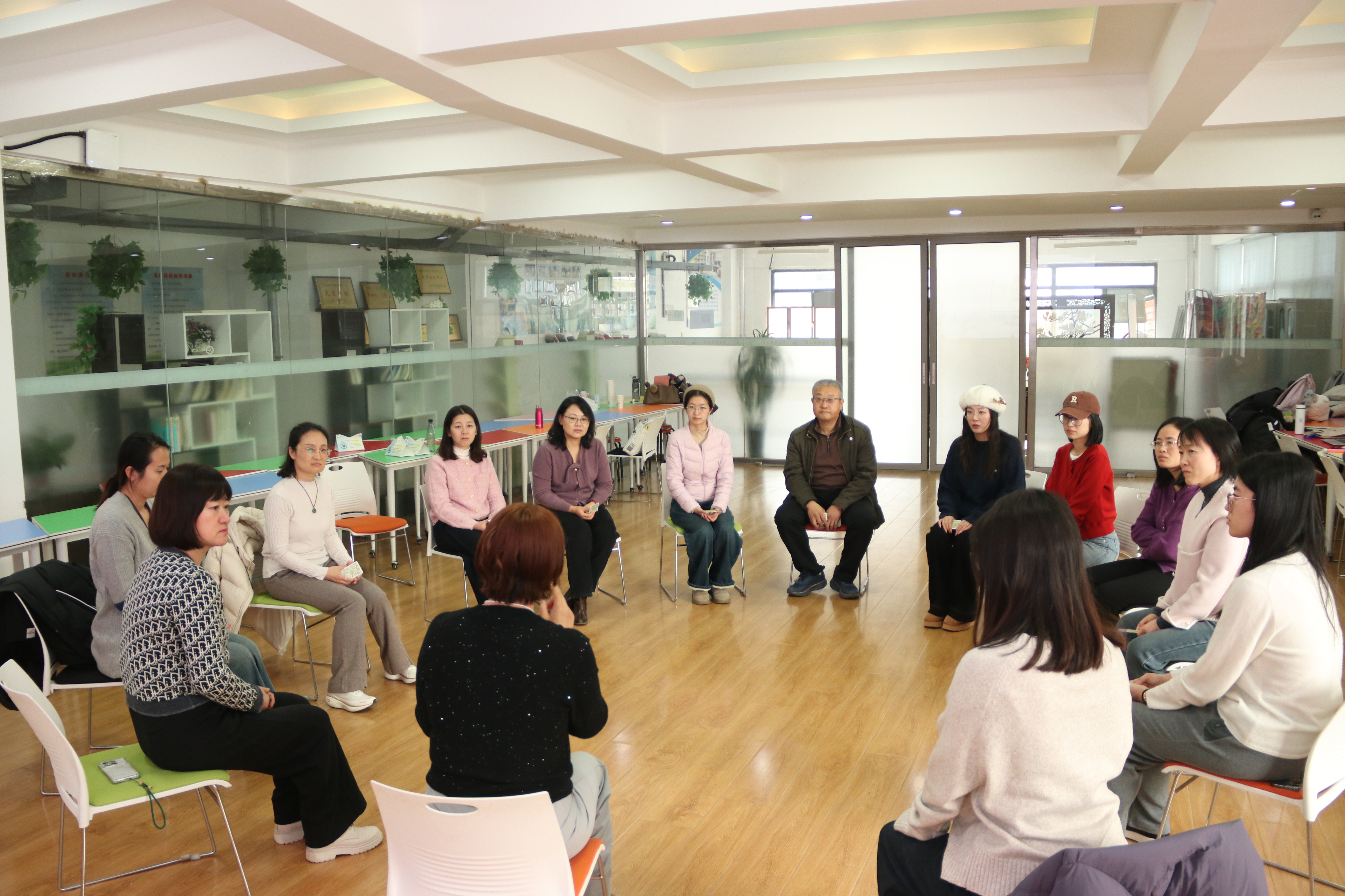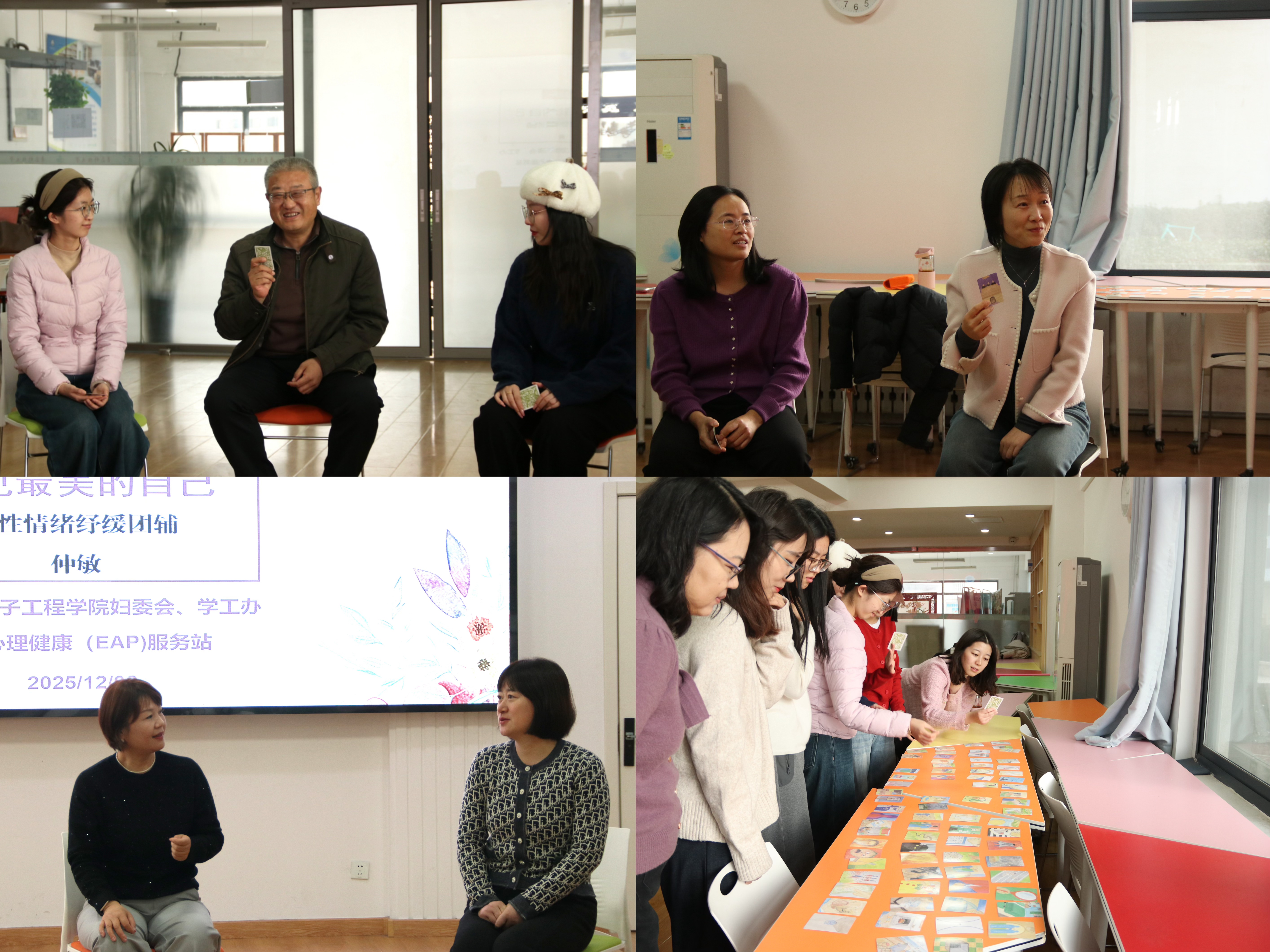 本次培训围绕“自我觉察-情绪管理-压力应对”三大模块展开:通过卡牌自我介绍进行破冰,引导教师从关注外在标签转向探索内在特质;聚焦女性教育工作者的成长阶段,结合20至50岁不同年龄层的真实案例,剖析了职业适应期、育儿平衡期等关键阶段的常见心理挑战;设置了25分钟的身体律动与正念呼吸冥想环节,帮助教师建立情绪、身体与认知的三维联结;最后,讲授了情绪降落法、EFT情绪释放术等实用的即时减压技巧。