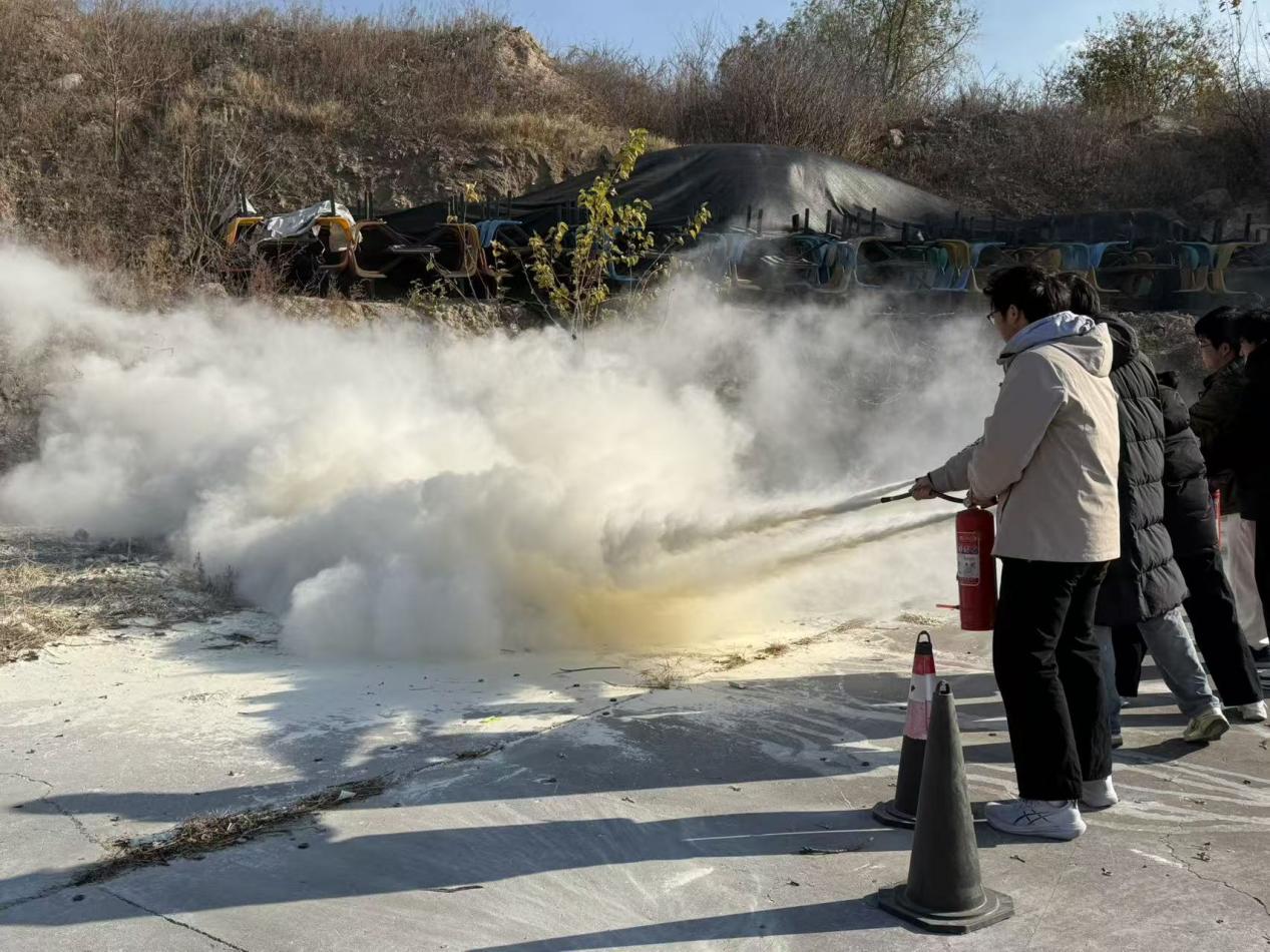 在位于北苑北侧停车场的灭火实操环节中,师生分批进行实战操作,熟练运用“提、拔、握、压”四步法成功扑灭模拟火源,有效掌握了初期火灾扑救的基本技能。