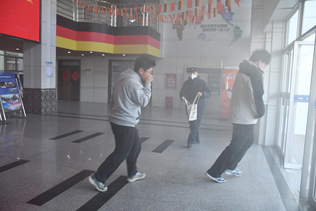 培训结束后,应急疏散演练正式开始。警报响起后,学生在辅导员和安全员的引导下,迅速采取低姿捂鼻、沿墙有序疏散的方式,按预定路线快速撤离至安全区域。