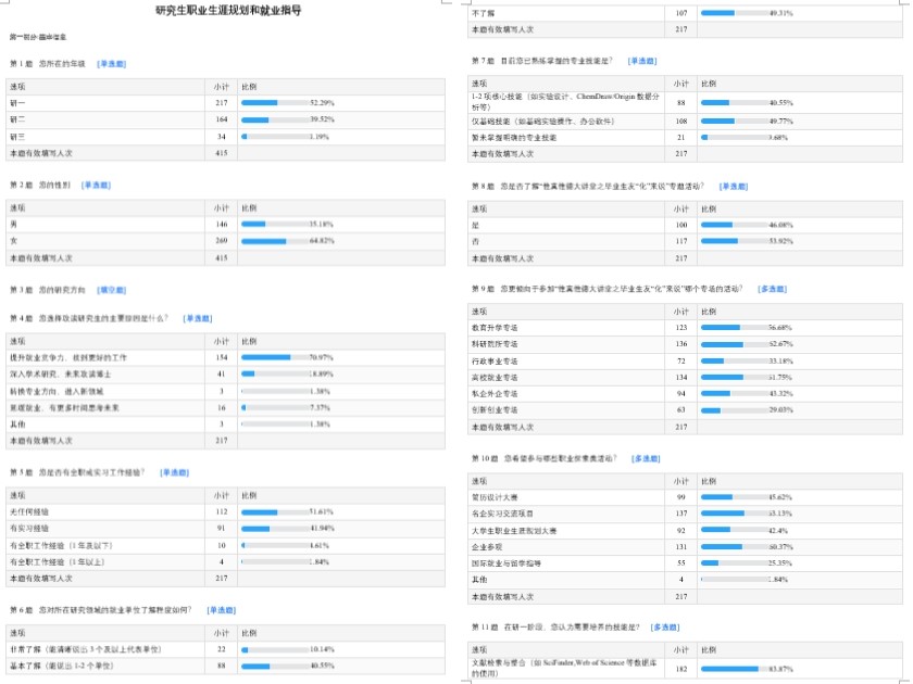 为精准聚焦同学们的求职与发展需求,持续优化升级“化育山海 青春化行”研究生就业助力项目,使其为同学们提供更精准、更有效的服务,20251118日,化学院研究生会开展研究生职业生涯规划与就业指导问卷调研活动。本次活动获得学院各年级研究生的积极响应,共回收有效问卷415份。