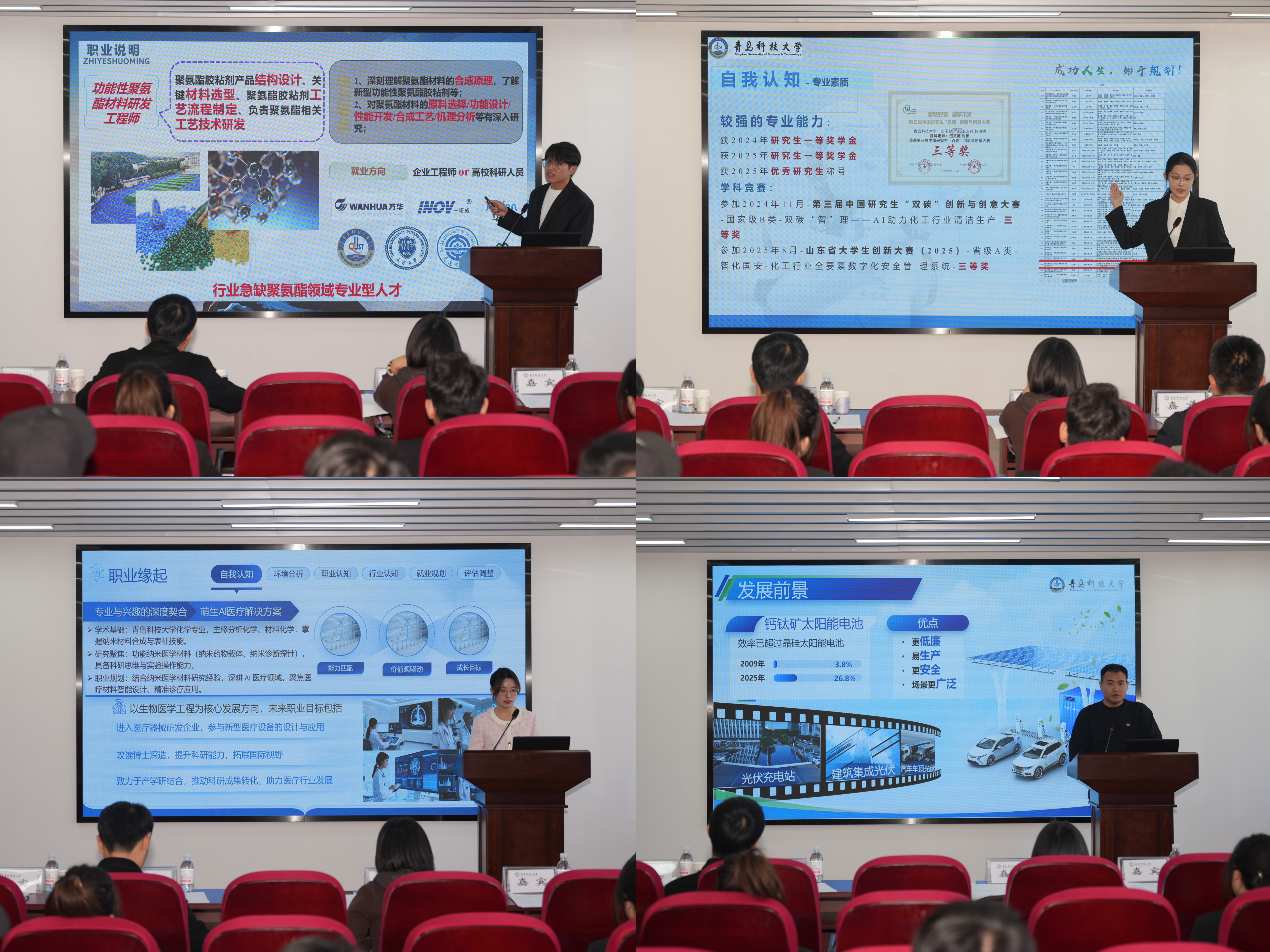 为进一步提升大学生的职业规划意识和就业竞争力,帮助学子找准职业定位、明确发展路径,11月18日,由化工学院与化学院联合主办、百诺医药股份有限公司协办的“百诺医药杯”大学生职业规划大赛在四方校区CCF814圆满落幕。学校学生工作处副处长兼就业指导中心主任徐华、山东百诺医药股份有限公司研究院人力资源部经理王倩倩、化工学院党委副书记兼副院长贾建闯、化学院党委副书记兼副院长刘尧受邀担任评委,100余名师生现场观看了比赛。