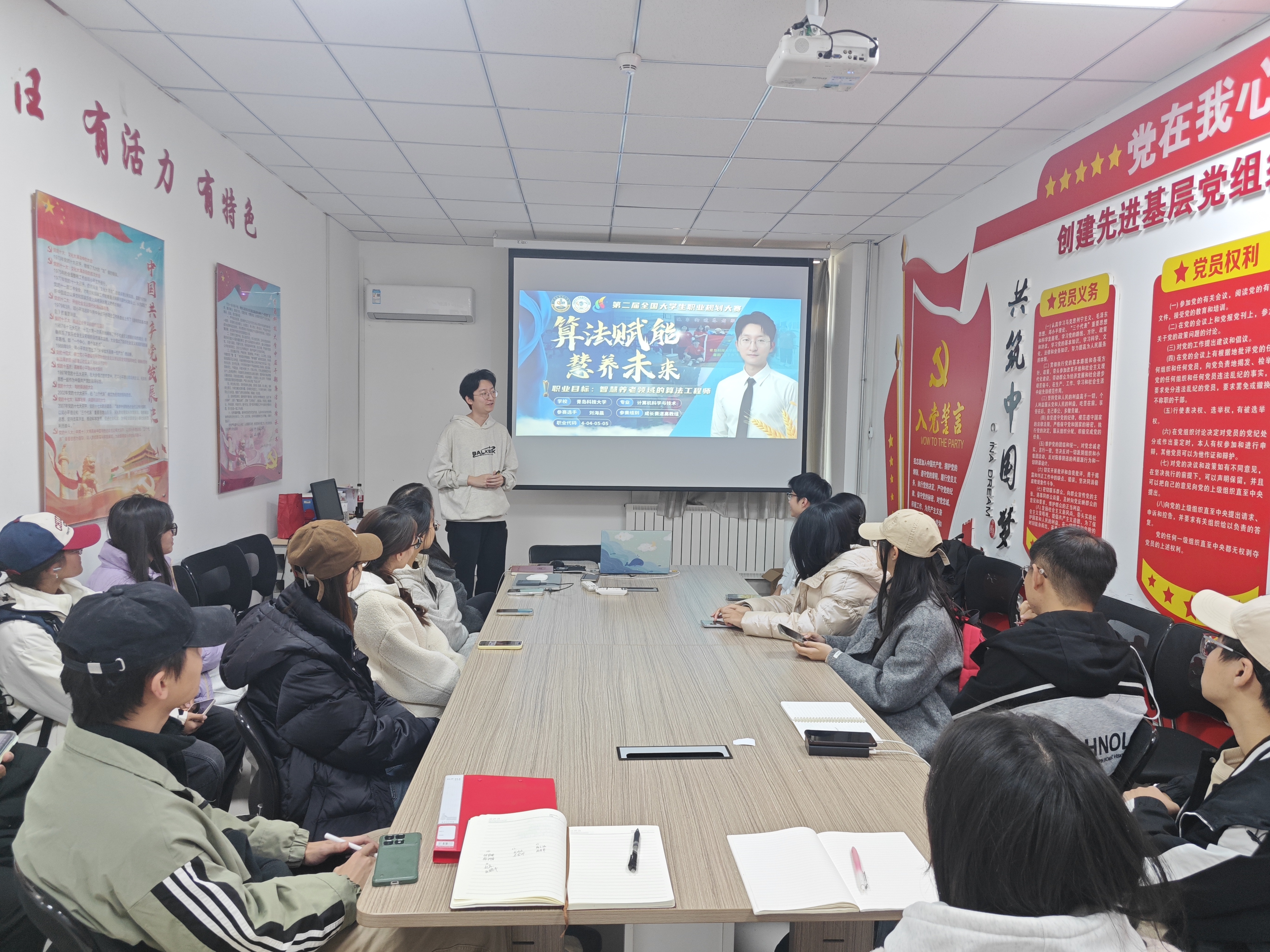 据悉,大赛前,信息学院组织20余位参赛种子选手参加培训会。会上,对大赛文件进行了详细的政策解读。同时邀请往届获奖者围绕职业目标的确定、实践行动的方法、优化改进的内容以及大赛的评分要点和备赛方法等方面进行了经验分享。