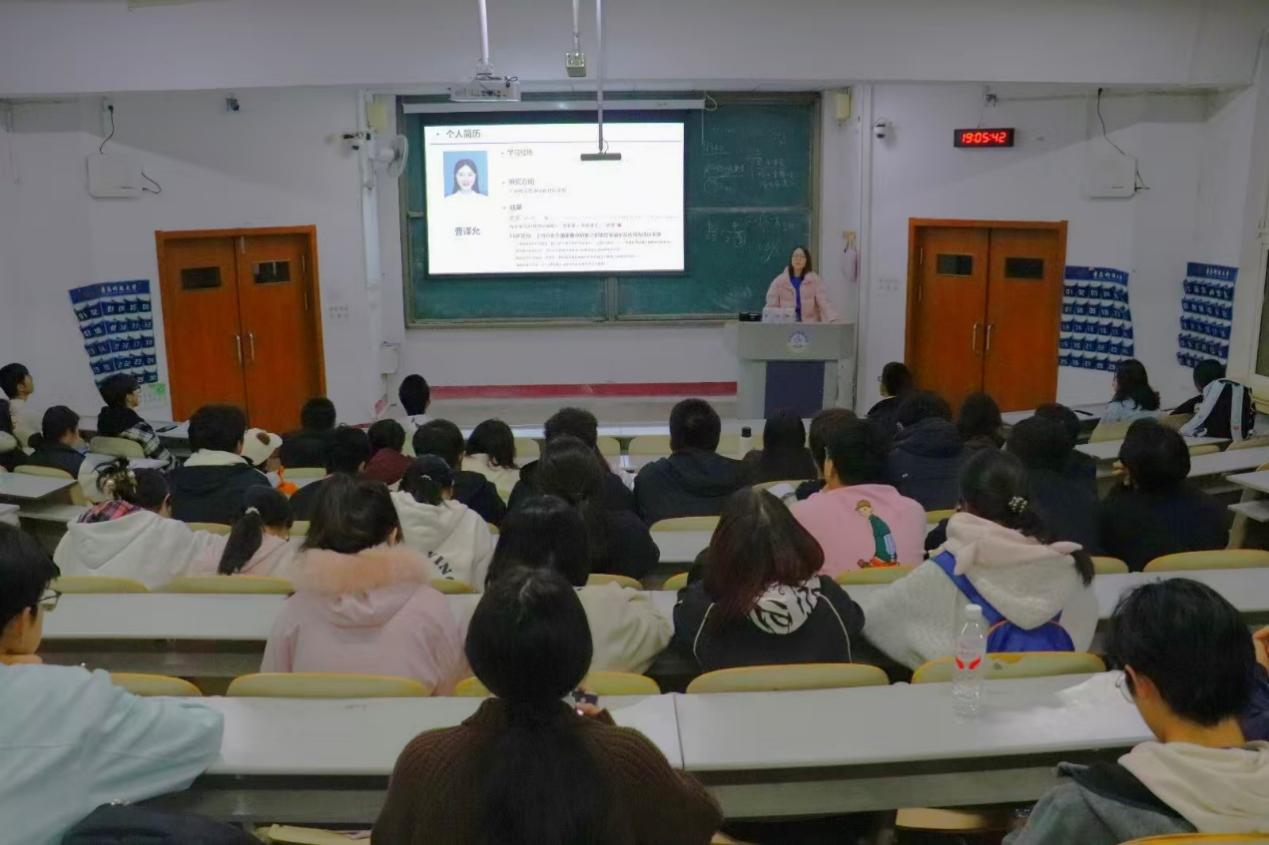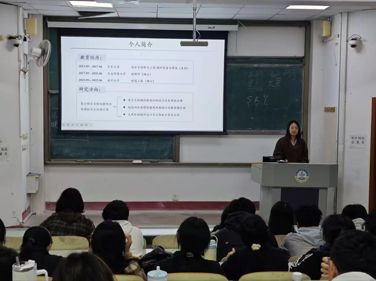 范慧琴围绕膜分离技术展开讲解,结合自身在聚合物分离膜领域的研究积累,介绍电渗析技术在水处理、环保等行业的应用,阐述膜结构调控难、分离效率低、稳定性不足等关键难题。她以“筛子分级筛选”类比引出离子交换膜的设计原理与性能优化特点,帮助同学们理解核心技术,最后分享膜材料研发实验案例,让大家对该领域的研究方向与应用前景有了直观深刻的认识。
