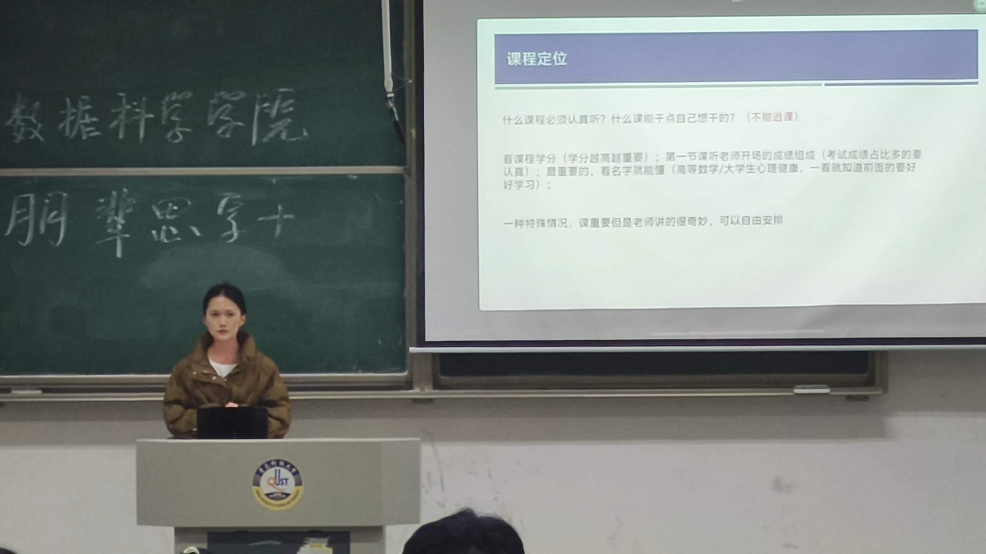 为帮助2025级新生精准掌握综合素质测评规则,科学规划大学学习生活,充分发挥朋辈榜样的示范引领作用,11月11日晚,数据科学学院延续“晚自习+经验分享”的特色形式,开展“朋辈思享+”之“学长学姐来帮你”系列经验分享会第三期,本次分享特邀优秀学生代表大数据242班孙洪茹担任主讲人,聚焦学业问题,为新生送上全方位、实用性强的综测与学习指导。