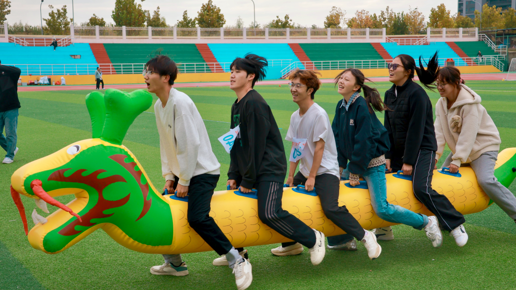 竞速毛毛虫项目更是掀起了全场的高潮,十余支队伍同台竞技、一较高下。赛前,各队伍熟悉道具、协调节奏,做好充分准备。赛道上的每一个身影都洋溢着青春的热血与拼搏的激情。