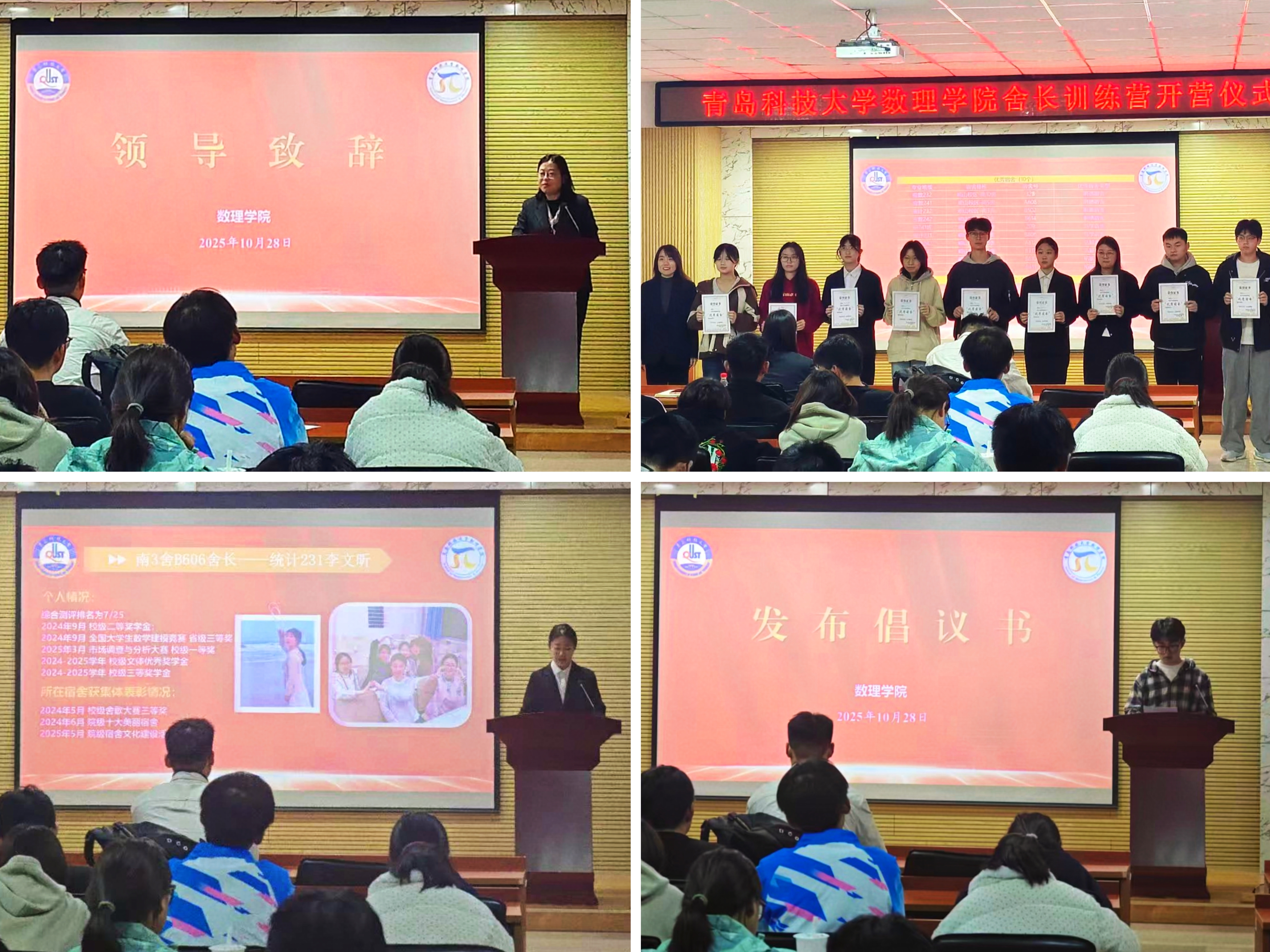 李雯雯为训练营启动仪式致辞,强调舍长作为“最小单元管理者”的关键作用,提出以服务者、协调者、守护者身份推动宿舍从“居住空间”向“成长乐园”转变,为舍长工作指明方向。仪式上,付凯为优秀宿舍代表颁奖,统计231李文昕和应数242齐宁静两名优秀舍长结合个人经历分享工作经验,优秀宿舍舍长、应数241唐正强向全体舍长发起倡议,引导全体舍长积极响应号召、充分发挥履职热情。