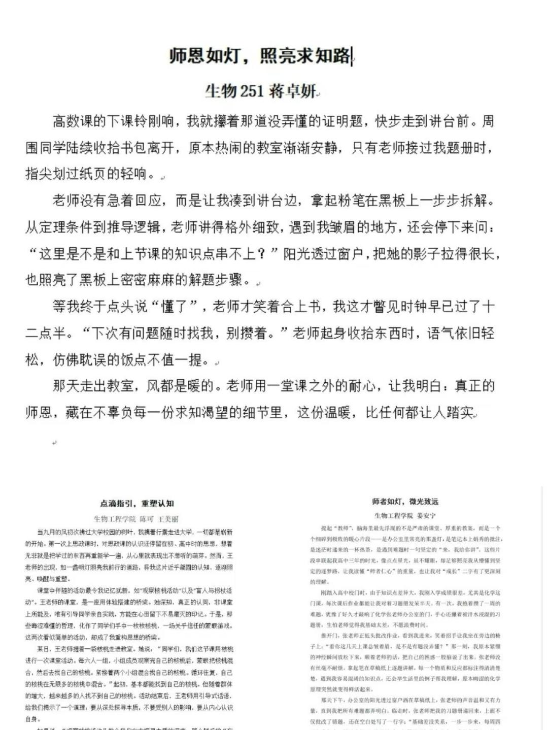 文字聚力颂师魂。为深化师生情感联结,以文字为载体定格师生相处的温情瞬间,生物工程学院组织开展线上短文征集活动,在本次活动中,同学通过撰写短文的形式,分享与老师相处的暖心故事,诉说埋藏心底的感恩与敬意,展现师生间的温情点滴,让老师们读懂了学生未曾言说的心意与深情。
