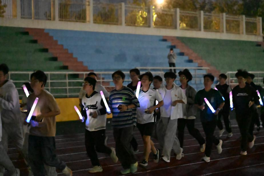 活动第一阶段,同学们沿着操场跑道完成两圈集体跑步,夜色之中,闪烁的荧光与奔跑的身影相互映衬,不仅生动展现出学子良好的精神风貌与过硬的身体素质,更让大家在集体奔跑的过程中深刻体会到:面对成长路上如黑夜般的挑战与荆棘,身边始终有并肩前行的伙伴,共同传递着青春的力量。