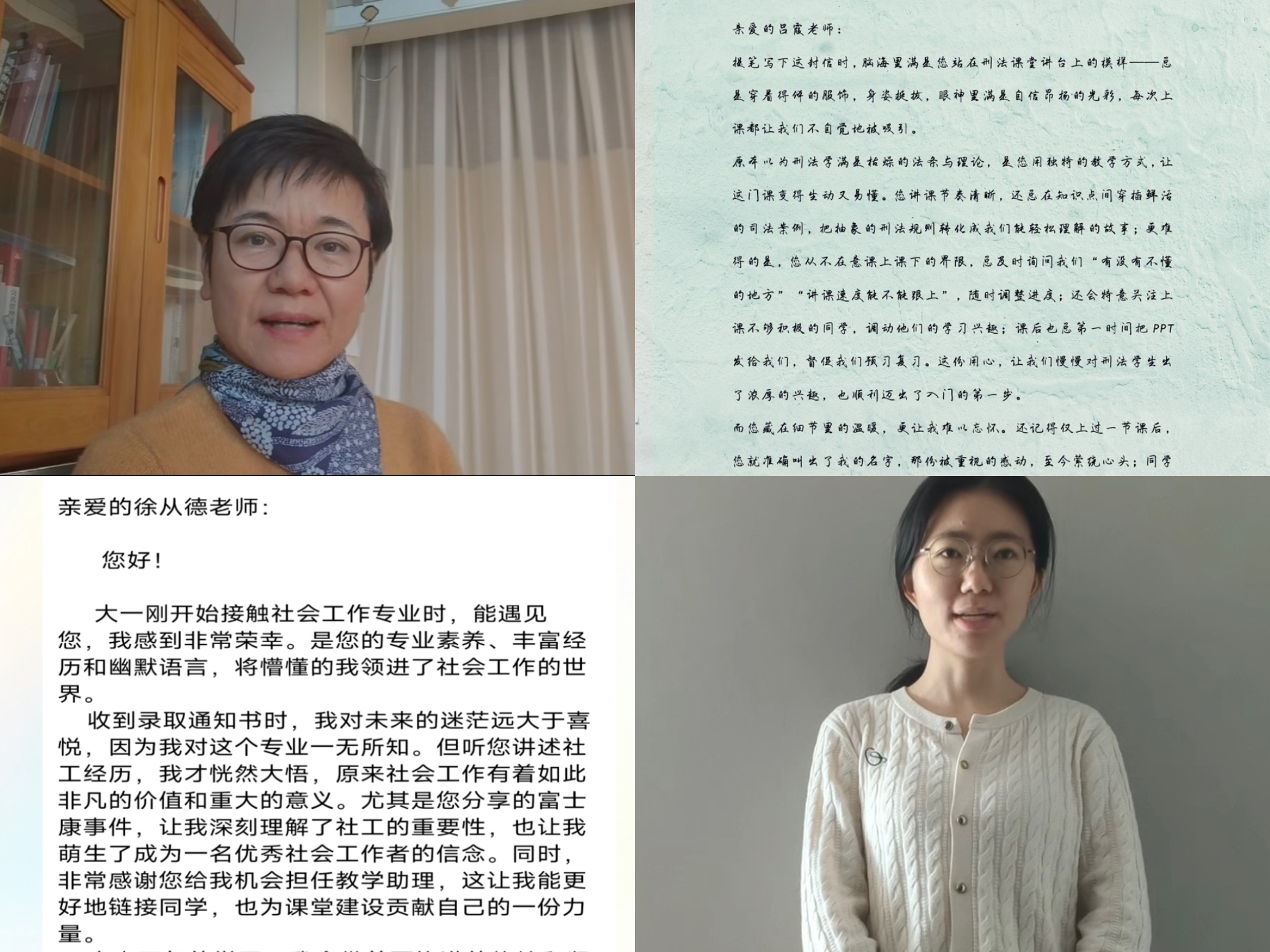 师爱如春雨,润物细无声。学院心理工作站在线上开展“师影传心”教师视频分享活动,邀请老师们通过镜头分享教学心得与人生寄语,推荐启迪心智的经典好书,将深厚的育人情怀融入每一帧生动的影像之中。“致老师的一封信”征集活动同步开展,同学们以笔寄情、以声传意,通过书信和视频诉说师恩难忘,用真挚的文字和温暖的声音,传递对老师的深深感激。
