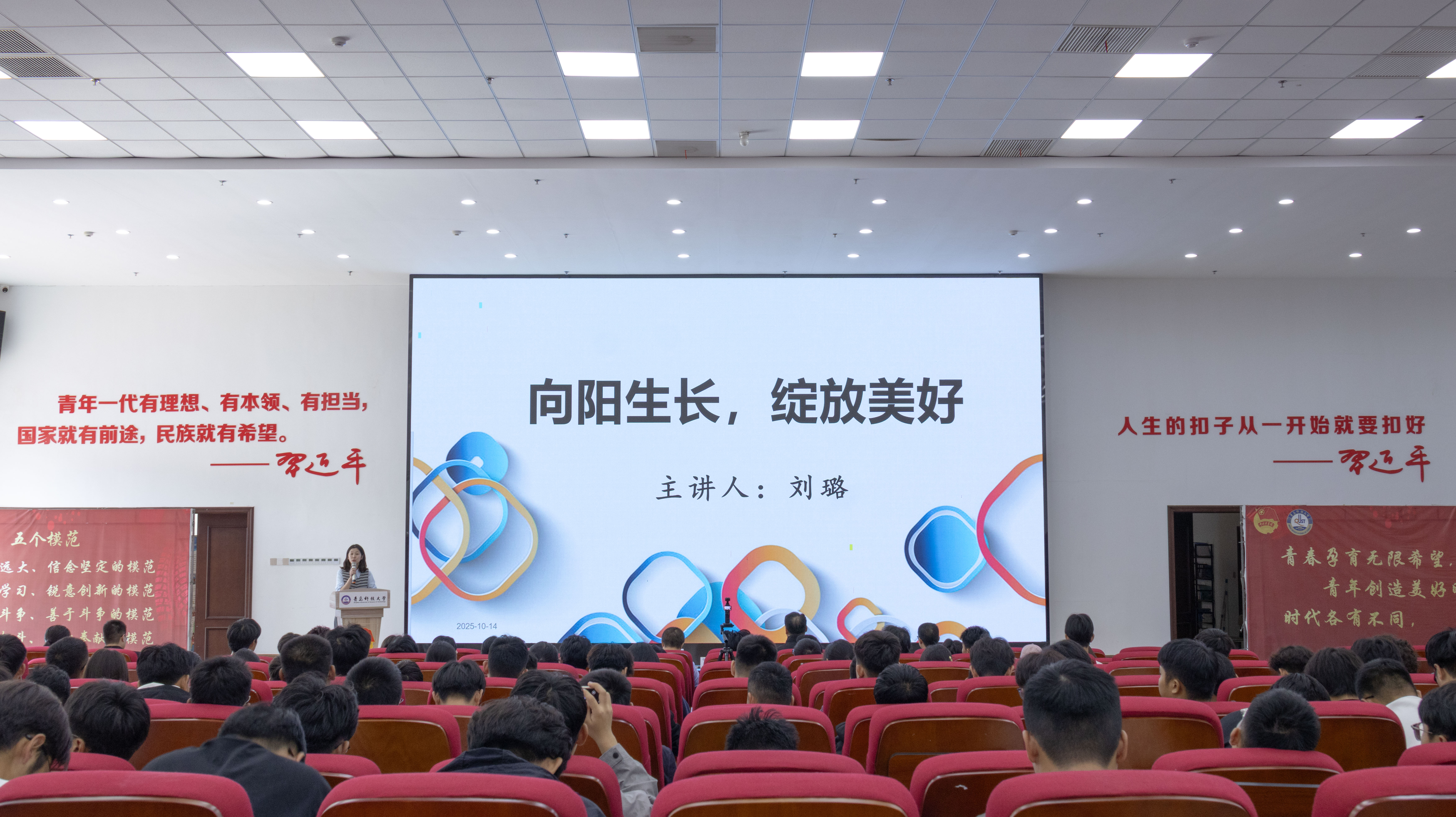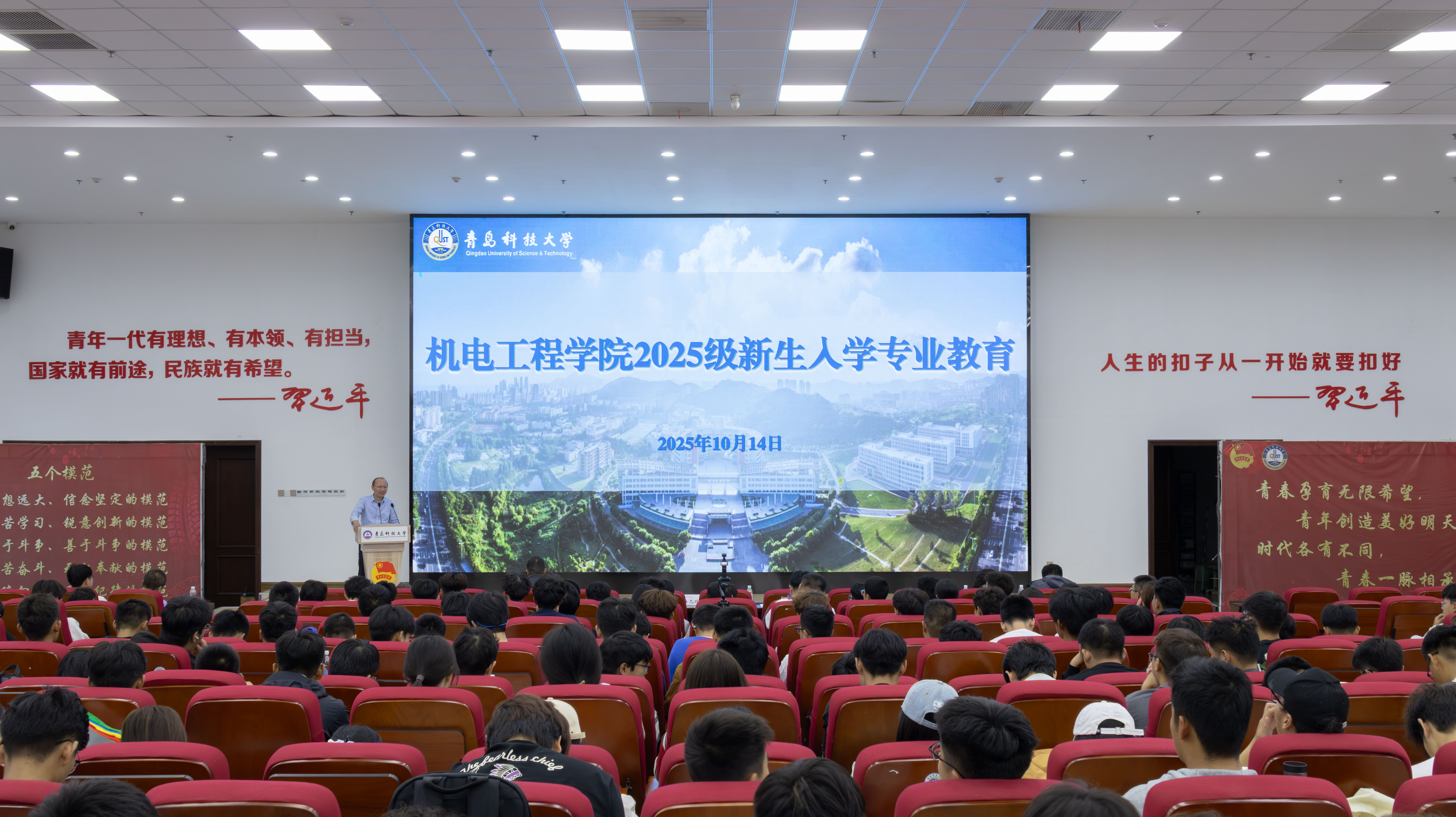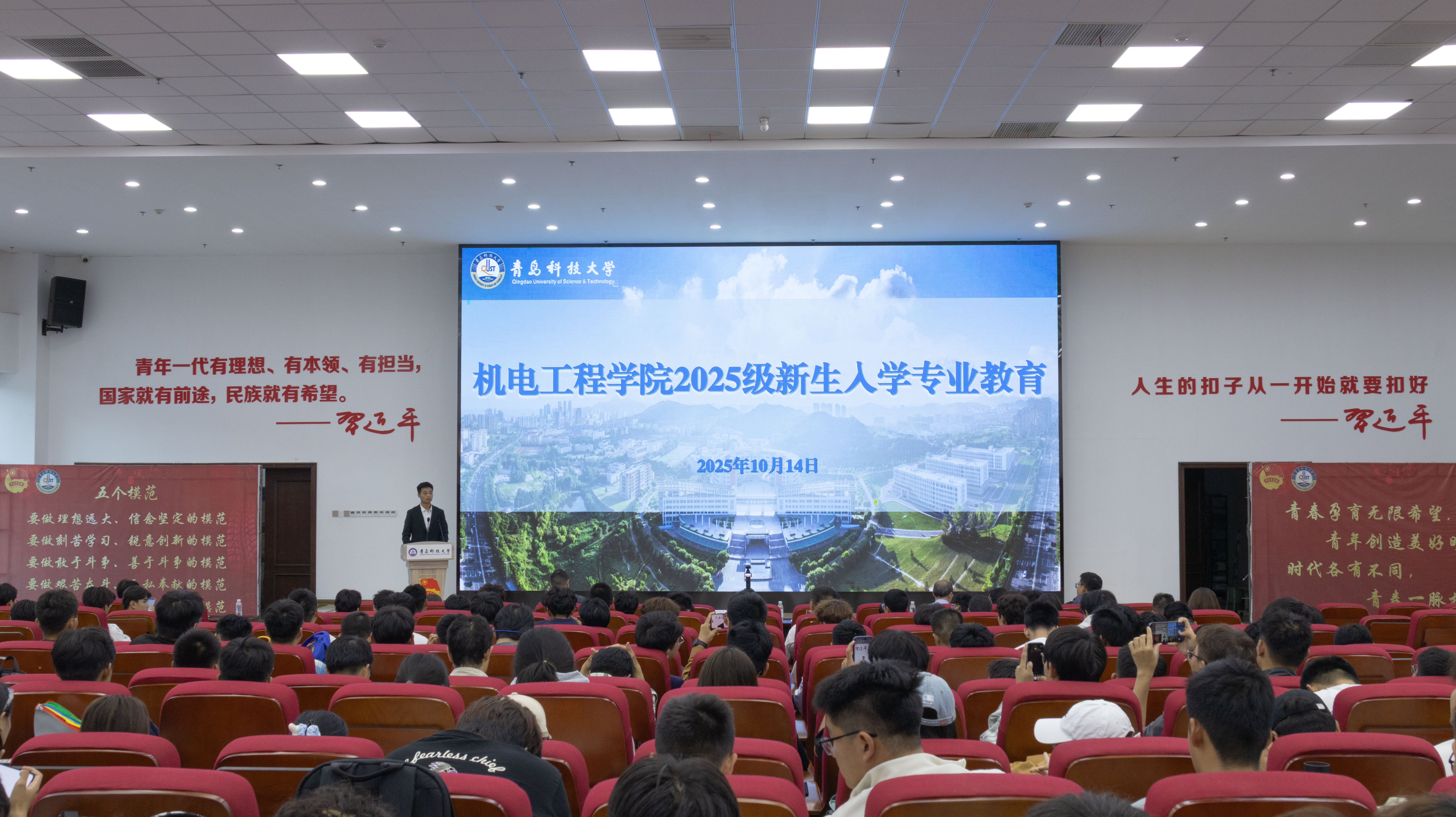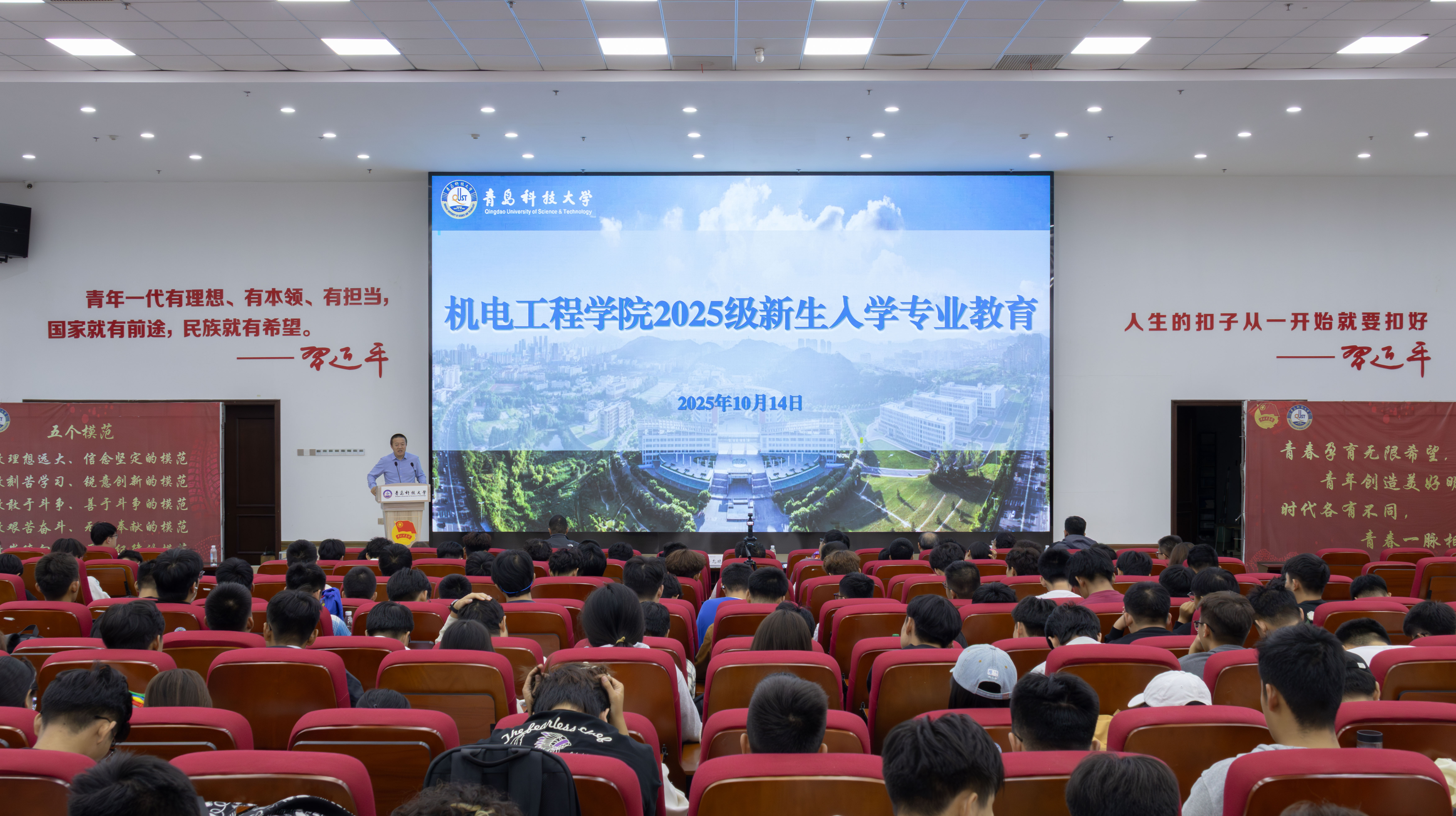 10月14日,机电工程学院2025级本科生新生入学教育大会在崂山校区北区报告厅分四场次举行。学校后勤处副处长兼校医院院长高术华、学校安全管理处消防科副科长余全波、学校心理健康教育与咨询中心副主任刘璐,机电工程学院党委副书记杨小明、副院长杨化林、李剑光、各教研室主任、2025级新生辅导员以及全体2025级全体新生参加大会。