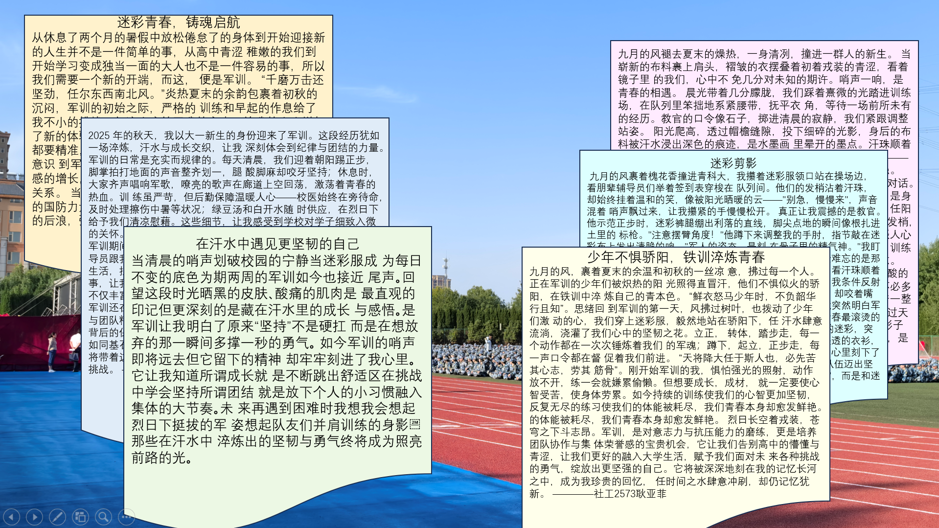 作为军训文化育人的重要载体,“迷彩青春,笔下(镜下)生花”作品征集活动吸引众多学生积极参与,创作出了涵盖征文、短视频、摄影、绘画、诗歌等多种形式的精彩作品,既生动记录了军训点滴,也为后续成果展示与精神传承奠定了基础。这些作品生动真挚地反映了学子们的军训体验与成长感悟。经专业评审遴选,优秀作品通过“e路相伴”公众号等平台进行系列展播,成为传递军训正能量、扩大教育影响力的重要载体。