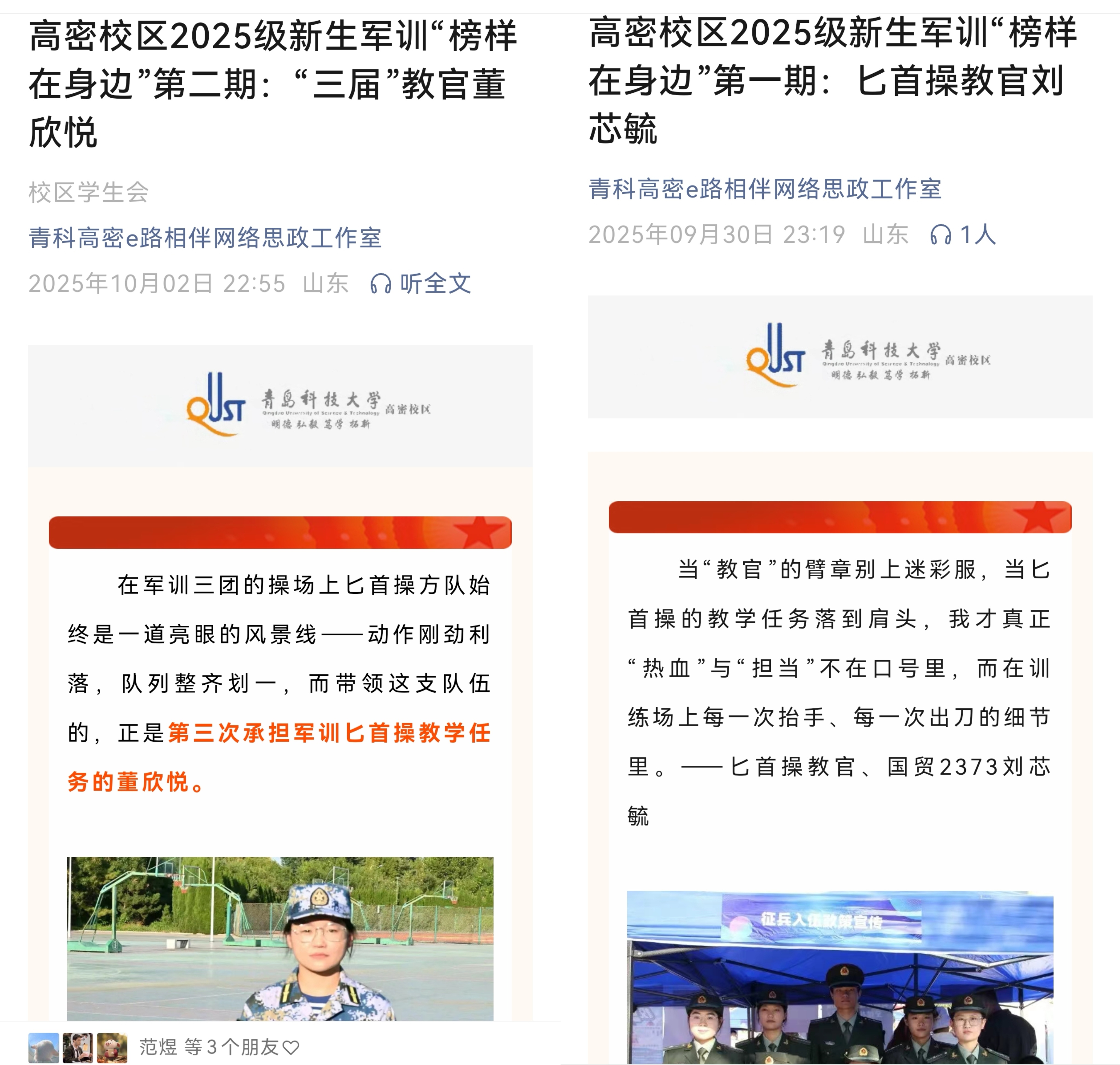军训期间,校区积极搭建文化创作与典型宣传平台,引导学生以笔墨和镜头记录所见所感、颂扬先进榜样,有效转化和固化军训育人成果,丰富了校园文化建设与思想政治教育资源。