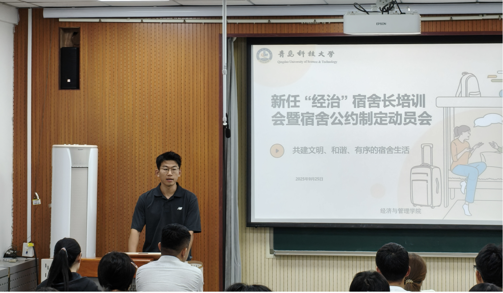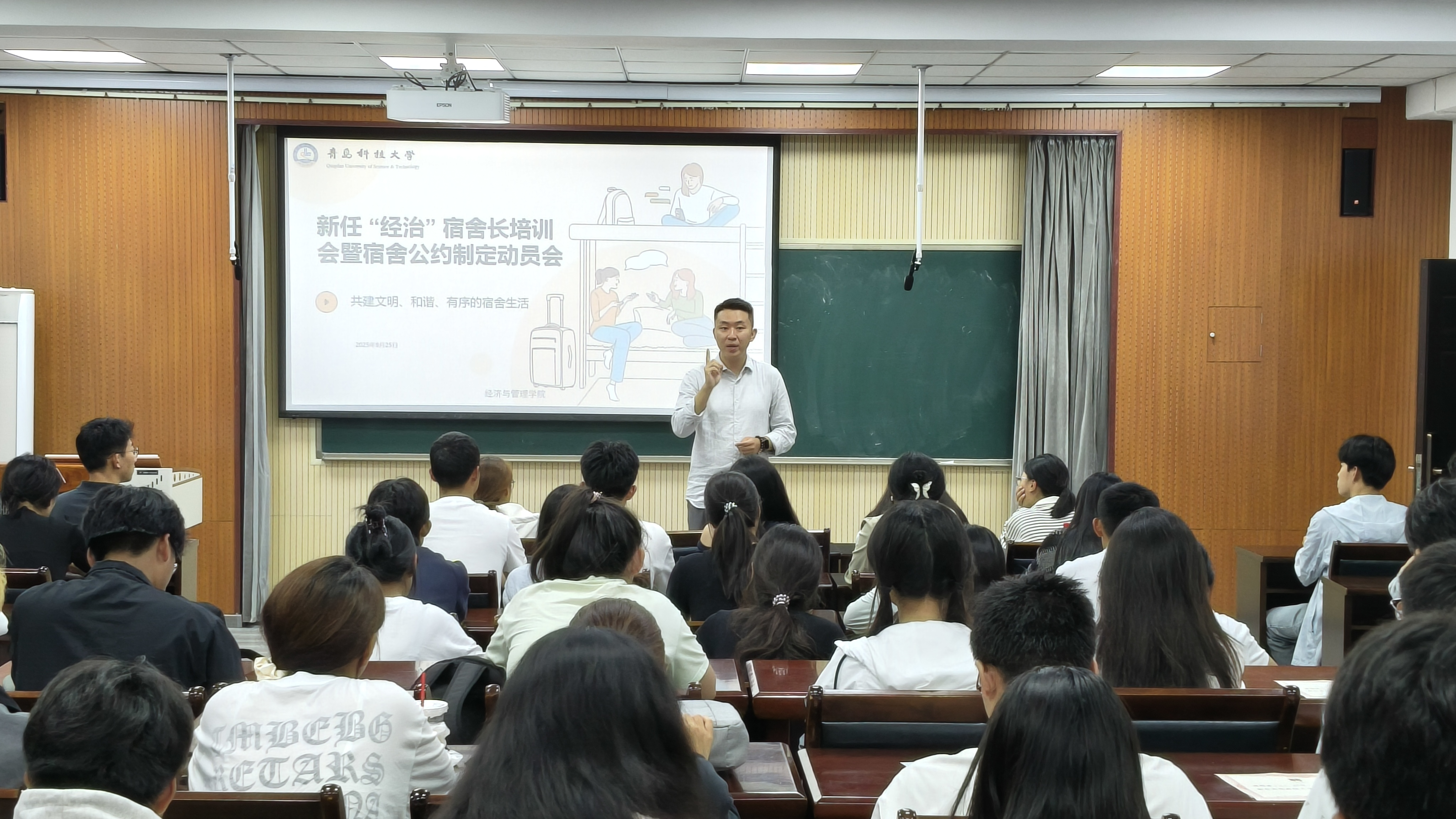 为充分发挥宿舍长引领力和组织力,提升宿舍管理水平与治理能力,深化学院“经治”品牌建设,9月25日晚,经管学院于经管楼419会议室举办“经治”宿舍长培训会暨宿舍公约制定动员会。经管学院2025级新生辅导员孙建树、吕欣哲、全体班级负责人与寝室长参会,会议由吕欣哲主持。