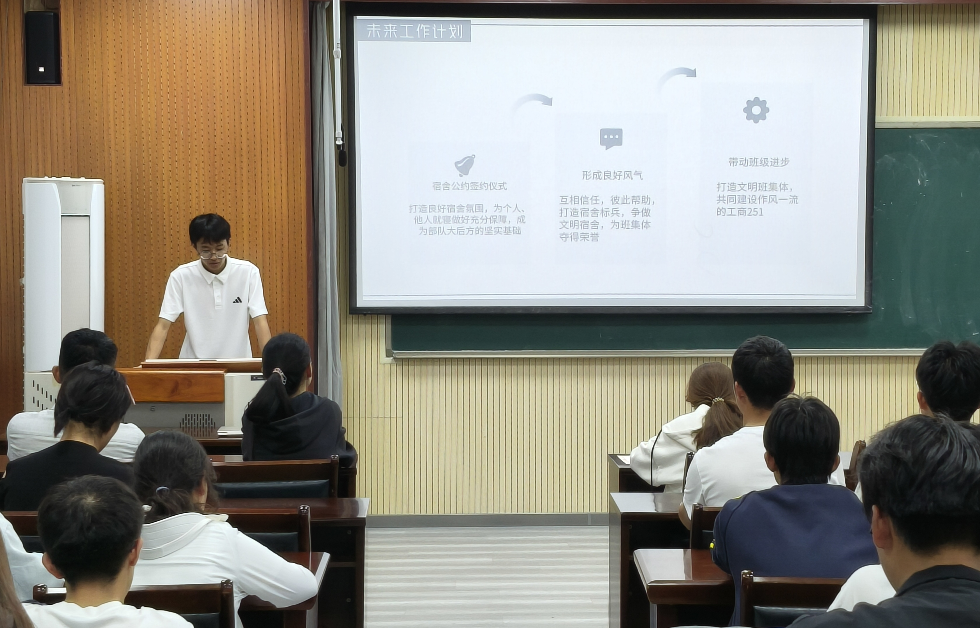接下来,工商管理251班负责人张晓瑞同学分享了班级宿舍管理经验。通过展示本班结合专业特色制定的宿舍公约与富有仪式感的签约现场照片,生动介绍了工管251班在寝室文化建设、学习互助等方面取得的初步成果,并呼吁全体负责人积极行动起来,组织班级同学共同商讨制定个性化的宿舍公约,携手营造团结友爱、积极向上的寝室环境,切实促进宿舍文明建设。